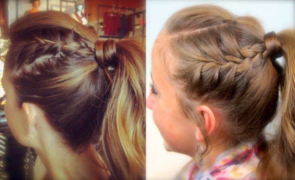 Для юных леди младших классов моно создать красивую прическу с использованием заколки с бантом и двух ленточек. Волосы собрать в высокий хвост. Создать обычную косичку, обернуть ее около основания хвоста, скрепить заколками.