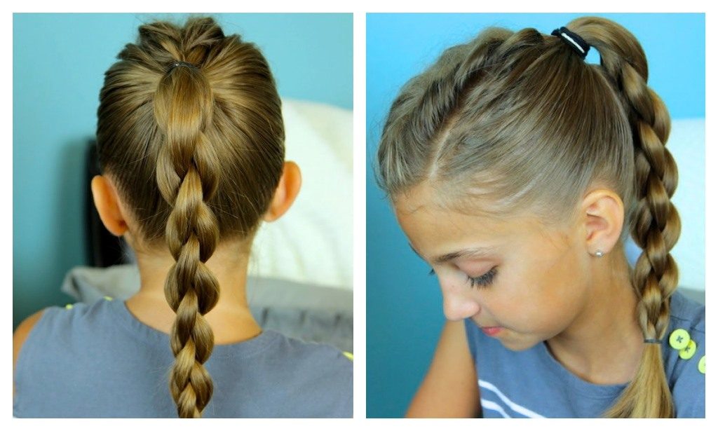 Ещё одна разновидность косы «рыбий хвост», которая заплетается из предварительно собранного хвоста. Главным плюсом такой причёски является то,что даже длинные волосы оказываются полностью убранными, а в течение дня, если у активной девочки косичка всё-таки растрепется, можно придать «вторую жизнь» причёске, превратив её в объёмный стильный пучок.