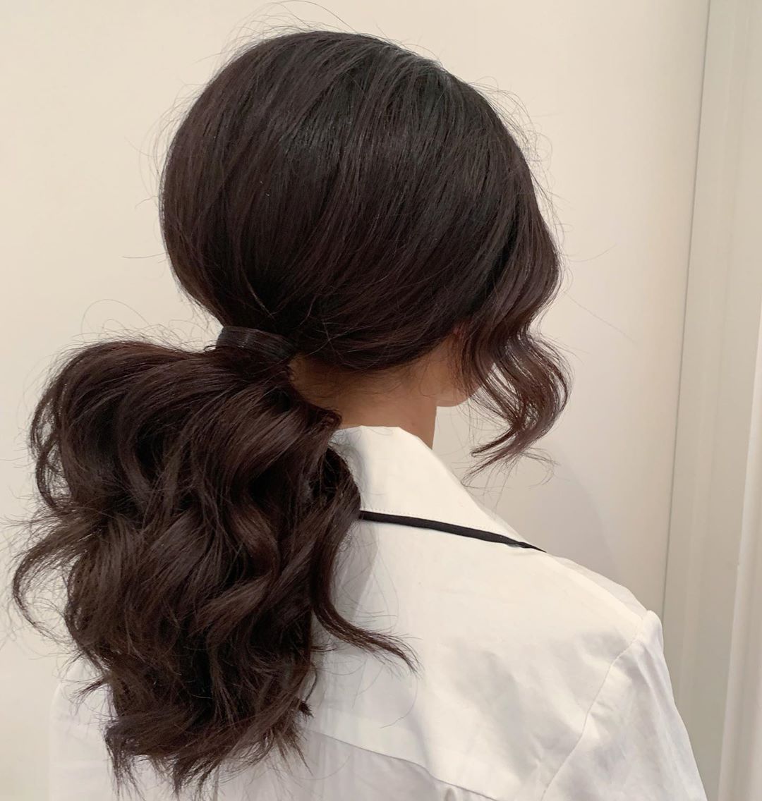 В тренде среди свадебных причесок – низкий хвост с крупными или мелкими локонами. С начесом или пробором – это уже на вкус невесты. Чаще всего выбирают низкий хвост набок, чтобы красивые локоны ложились наперед.