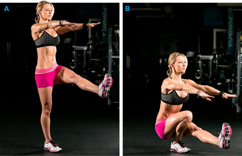 Выпад с подъёмом колена. Поможет в качественной проработке ягодиц. Его техника немного сложнее классического выпада. Выполняя это упражнение нужно сделать высокий мах коленом вверх и опуститься в присед. Ноги менять поочерёдно.