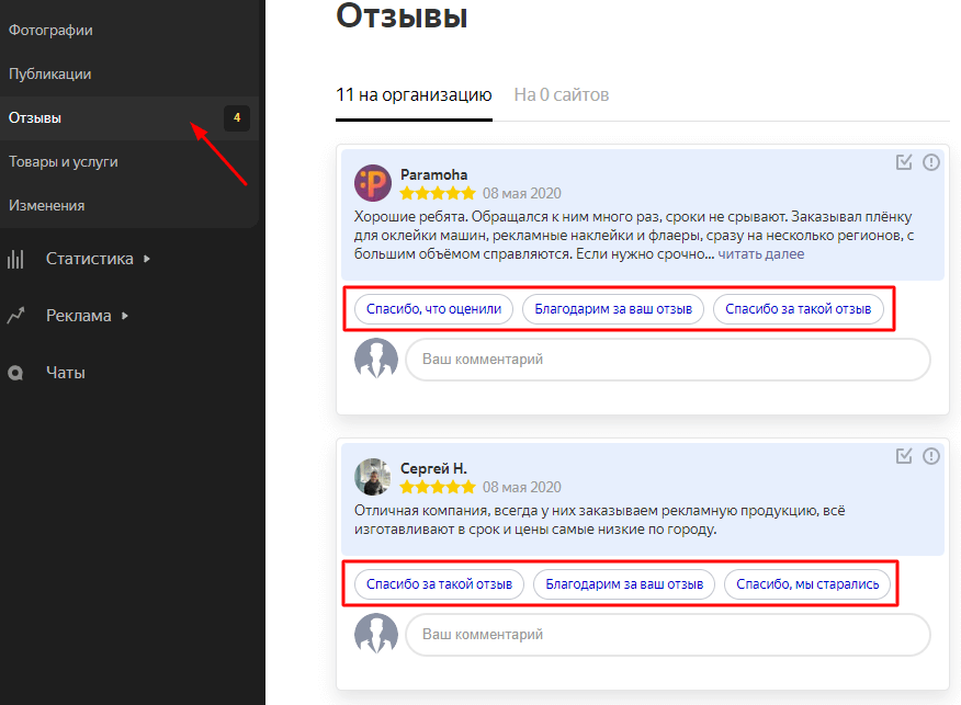 • Работайте с отзывами. Старайтесь отвечать на каждый отзыв о вашей компании (у Справочника даже есть быстрые ответы, с помощью которых можно отвечать клиентам). Помните, отзывы влияют на принятие решения о покупке или посещении заведения
