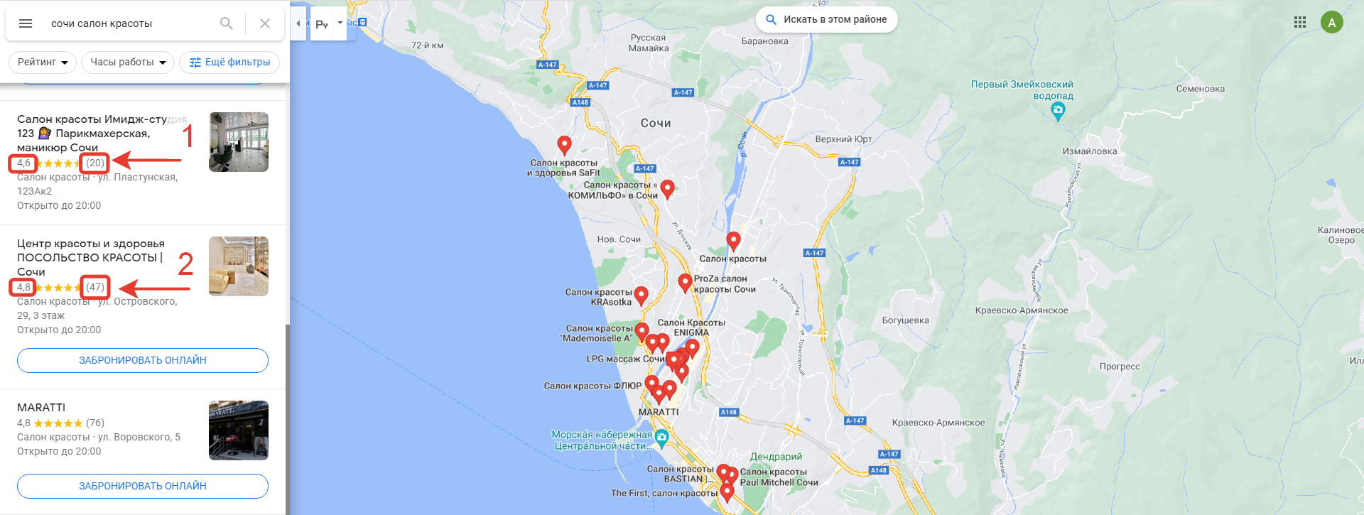 В 1-м салоне меньше отзывов и рейтинг сам ниже, но он ВЫШЕ в выдаче, чем 2-й