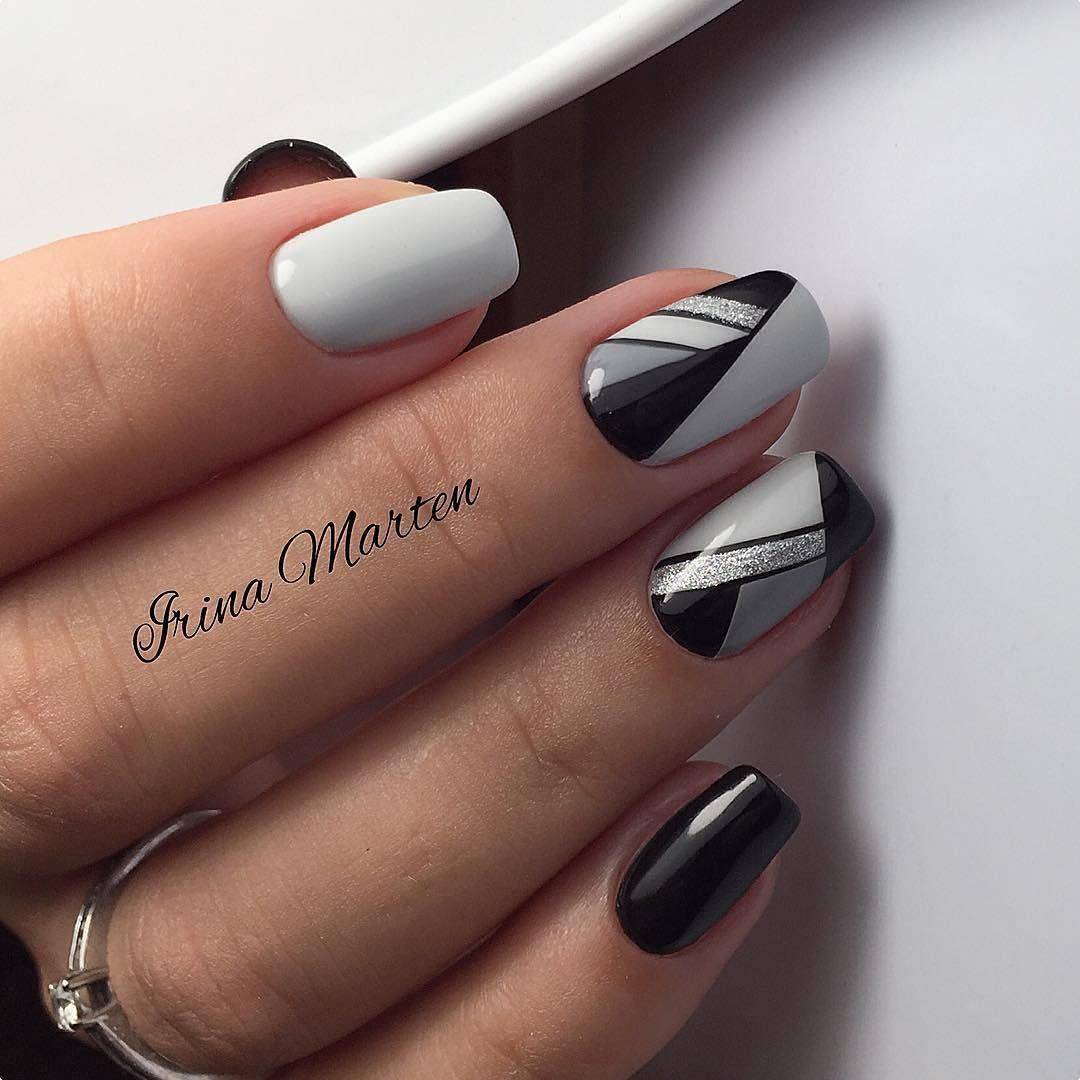 В тренде черный дизайн с тонкими белыми полосками, расположенными в хаотичном порядке, дизайн с геометрическими животными, с яркой геометрией в сочетании с черным цветом на других ногтях. Помимо белого цвета используйте голубой, серый, кремовый и другие светлые оттенки.