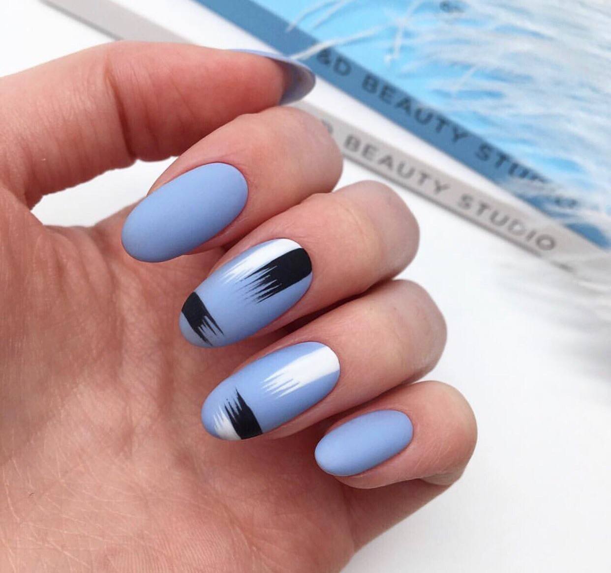 - Одну из частей закрашивают, например, лаком голубого цвета; с помощью черного лака и тоненькой кисточки наносится черная полоска, отделяя окрашенную голубую часть. В результате получился маникюр с четким контуром лаков контрастных цветов.