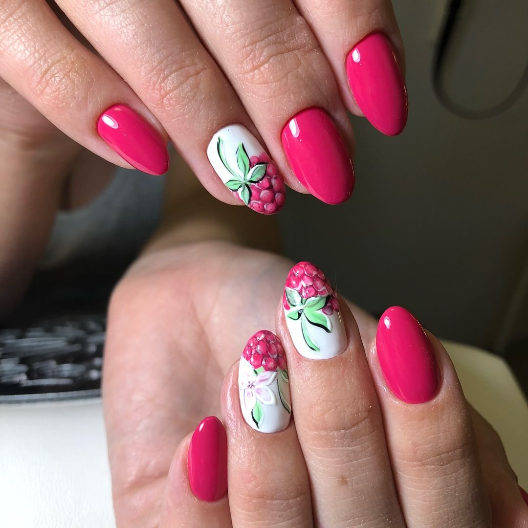 Романтичного настроения маникюру добавит цветочный дизайн. Его можно делать в розовых тонах на покрытии другого цвета, создавать цветочные узоры на розовом фоне. Цветочный дизайн можно создать росписью, стемпингом, наклейками, аппликацией. Стиль оформления может быть разным: