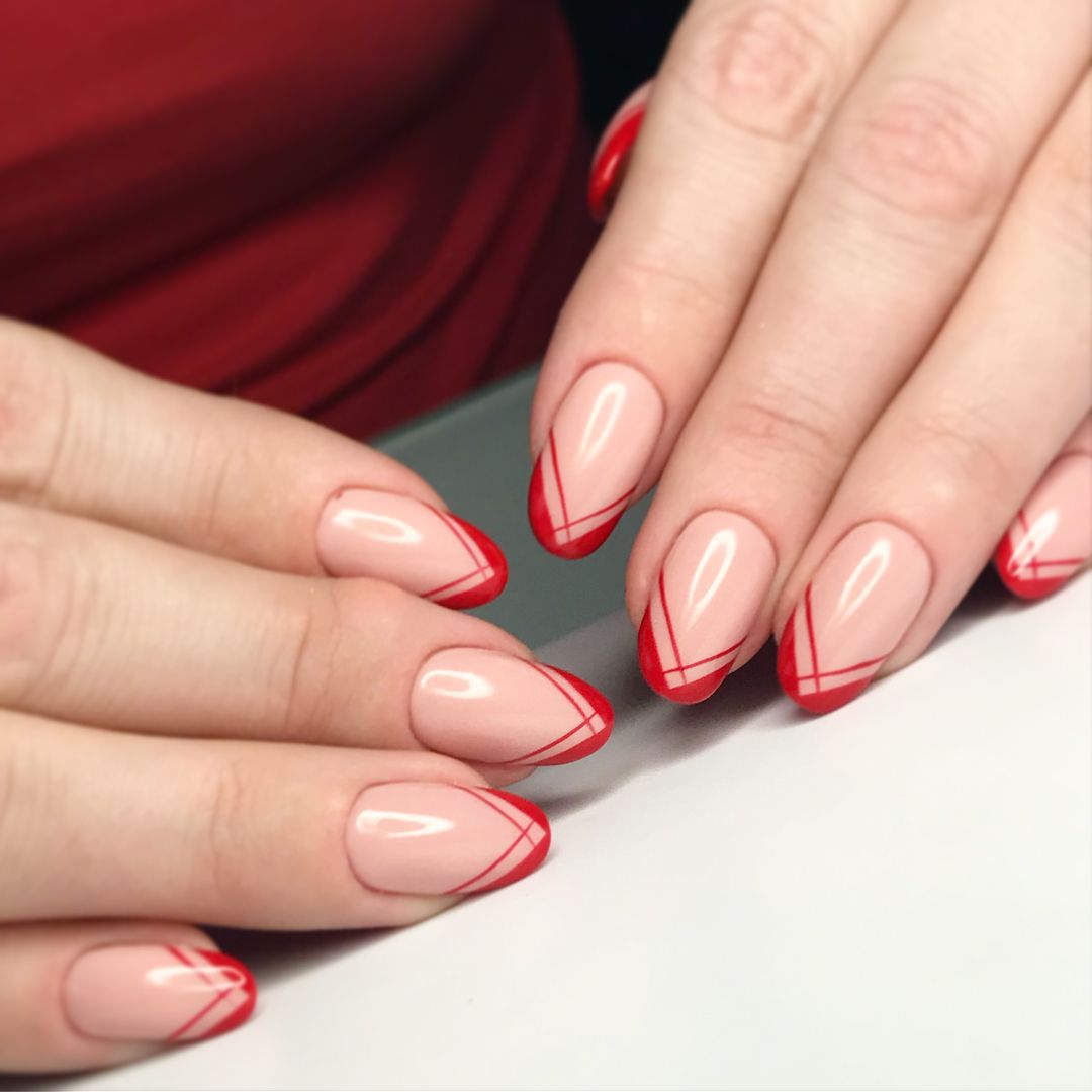 Создавая френч в красном цвете, стоит учитывать форму ногтей и конфигурацию «улыбки». В тренде необычная форма, смещенная, вертикальная или косая. Нестандартное оформление френча сделает дизайн интереснее.