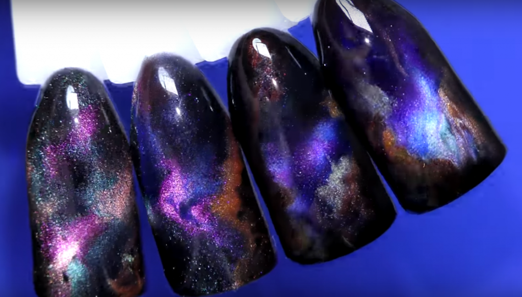 Этот нереальный космический дизайн для начинающих создается буквально за пару минут. Галактическое пространство, миллиарды звезд и дивный перелив оттенков изящно будут сиять на ваших ноготках.
