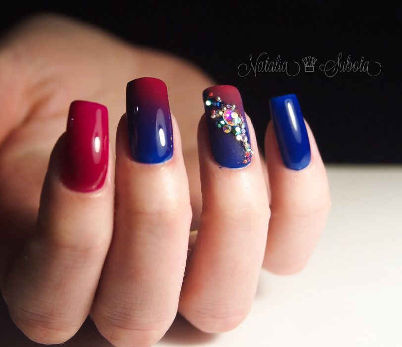 В этом году синий оттенок сам по себе модный и трендовый. Главное придумать интересный дизайн и оформление ногтей. Подчеркнуть глубину синего маникюра можно использовав гель-лак кошачий глаз в комплексе с полупрозрачным витражным покрытием. Для вечернего модного маникюра не грех использовать россыпь страз Swarovski, ведь сейчас как никогда актуальна инкрустация ногтей. Можно поэкспериментировать с различными втирками и найти гармоничное сочетание синего и металлика. Ну и попробовать себя в “модной геометрии”. На данный момент пользуется спросом дизайн с полоской оформленной в виде рисунка, градиента или декорированная стразами и мелким бисером.