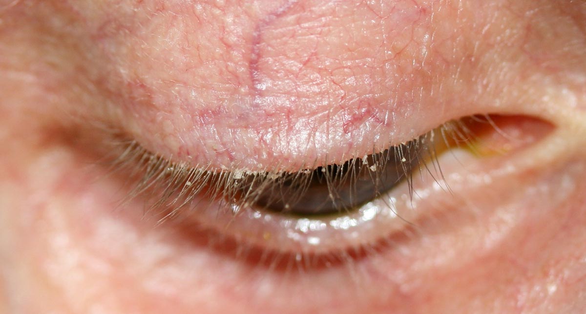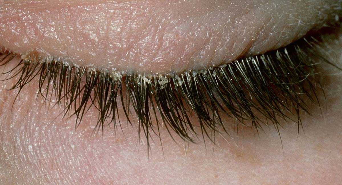 - При чешуйчатом блефарите на утолщенном и гиперемированном крае века скапливаются чешуйки слущенного эпидермиса и эпителия сальных желез, которые плотно прикрепляются к основанию ресниц. Чешуйки кожи также определяются на бровях и волосистой части головы. Течение себорейного блефарита может сопровождаться потерей и поседением ресниц.