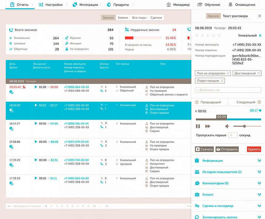 В личном кабинете отчеты по звонкам доступны в разрезе источников и сегментов. Есть данные о количестве посетителей, звонков, коэффициенте конверсий. В расширенных отчетах указаны данные по UTM-меткам и ключевым запросам.