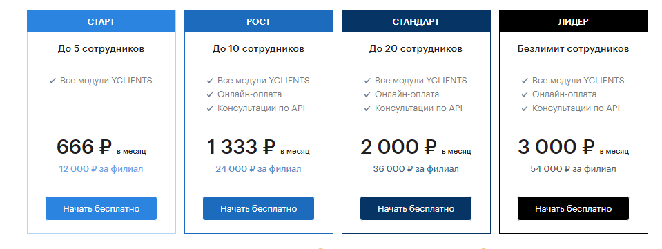 Из недостатков – нет бесплатного тарифа, только пробный период 7 дней. Цены от 666 и до 3000 руб. за месяц. Стоимость указана за 1 филиал, то есть, при подключении 3 салонов сети на дорогой тариф, ежемесячная плата будет составлять 9000 руб.
