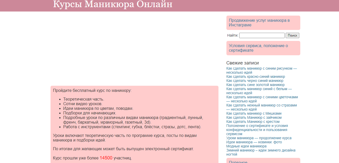 Портал Masterakrasoti.ru существует с 2011 года. За эти годы здесь осваивали мастерство ногтевого сервиса более 8000 человек. На сегодняшний день он предлагает обучение как в очной форме, так и онлайн. В каждом из трех тематических разделов имеется около десяти разных курсов. Среди них есть как традиционные, так и те, которые затрагивают нестандартные ситуации. Например, есть отдельный проект, посвященный проблеме вросшего ногтя. А многих мам, возможно, заинтересует видеокурс, рассказывающий о правильном уходе за детскими руками и стопами.