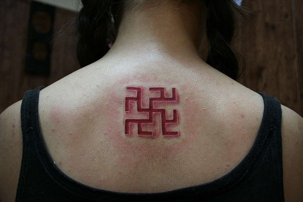 Подходит славянская символика и в качестве татуировки на шрамах. Универсальность объясняется тем, что изображение может быть любого размера и его легко сочетать с другими славянскими рисунками. Поэтому славянские тату обереги легко замаскируют даже сложные и многочисленные рубцы.