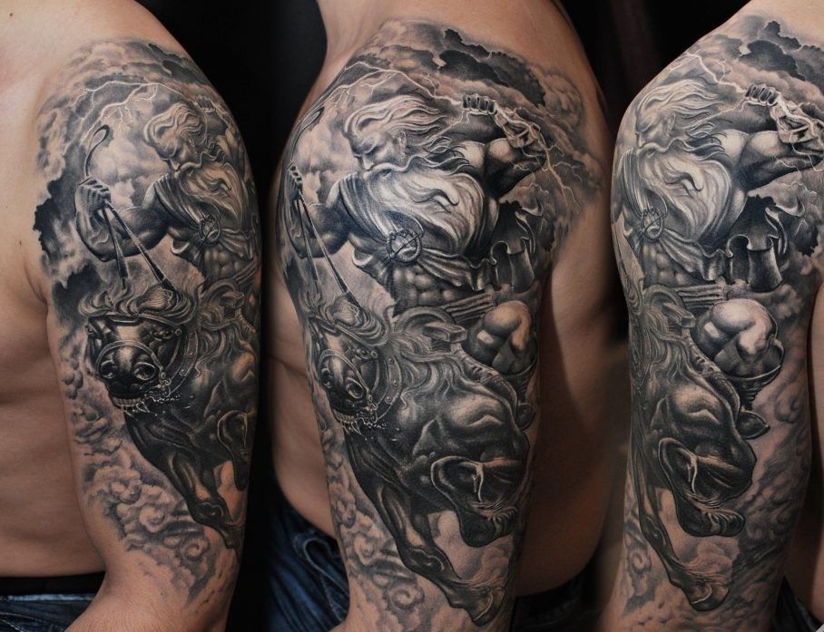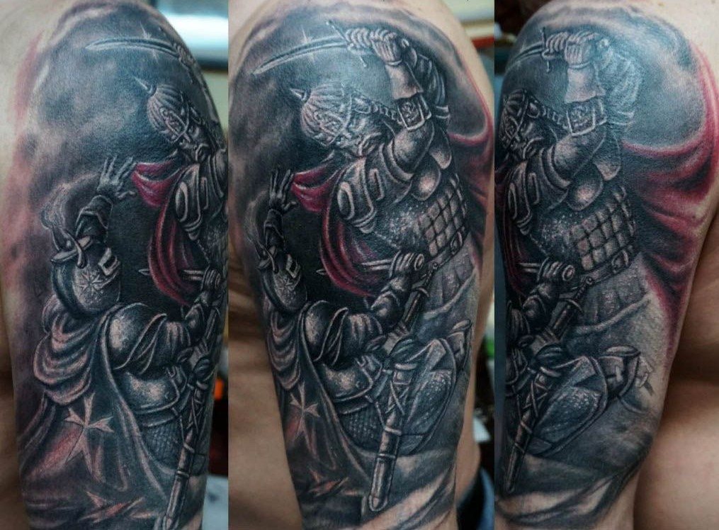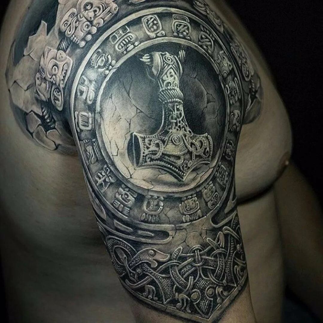 Цветовая гамма для мужских тату чаще всего тёмная, с использованием чёрного и серого цветов. Тёмные мужские татуировки на плече, фото которых вы отыщете на нашем сайте, имеют чёткие контуры и качественно прорисованные элементы, рисунок выглядит привлекательно и притягивает к себе все взгляды. Плечо прекрасно подходит для изображения чёрно-серых рисунков воинов, в шлемах и с оружием – благодаря изгибам и мускулам тату выглядит объёмно и очень реалистично. Такие старославянские татуировки для мужчин, в наши дни получившие множество вариантов и сюжетов, отличаются своим колоритом и неповторимым сочетанием древнего и современного.