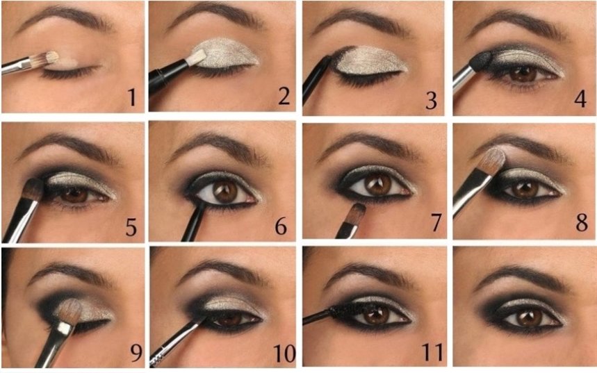 В переводе с английского smoky eyes означает «дымчатые глаза». Главная особенность такого макияжа заключается в плавном переходе теней от тёмного к светлому. Эффект исчезающей дымки создают с помощью 3−4 оттенков, которые наносят на веко и растушёвывают при помощи специальной кисти. Со спонжем добиться желаемого результата не получится.