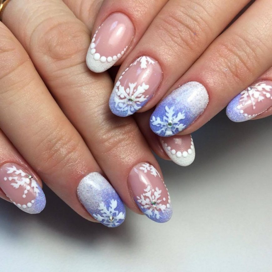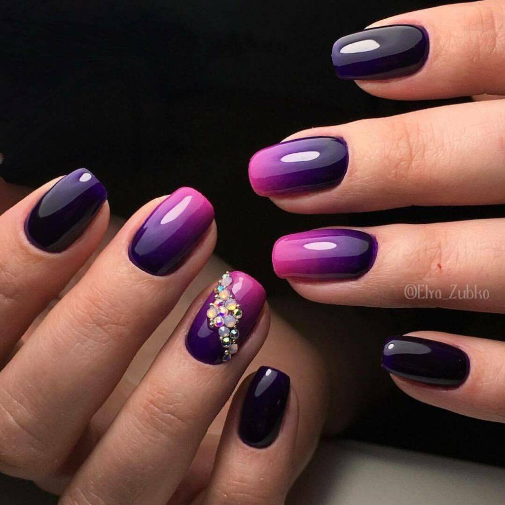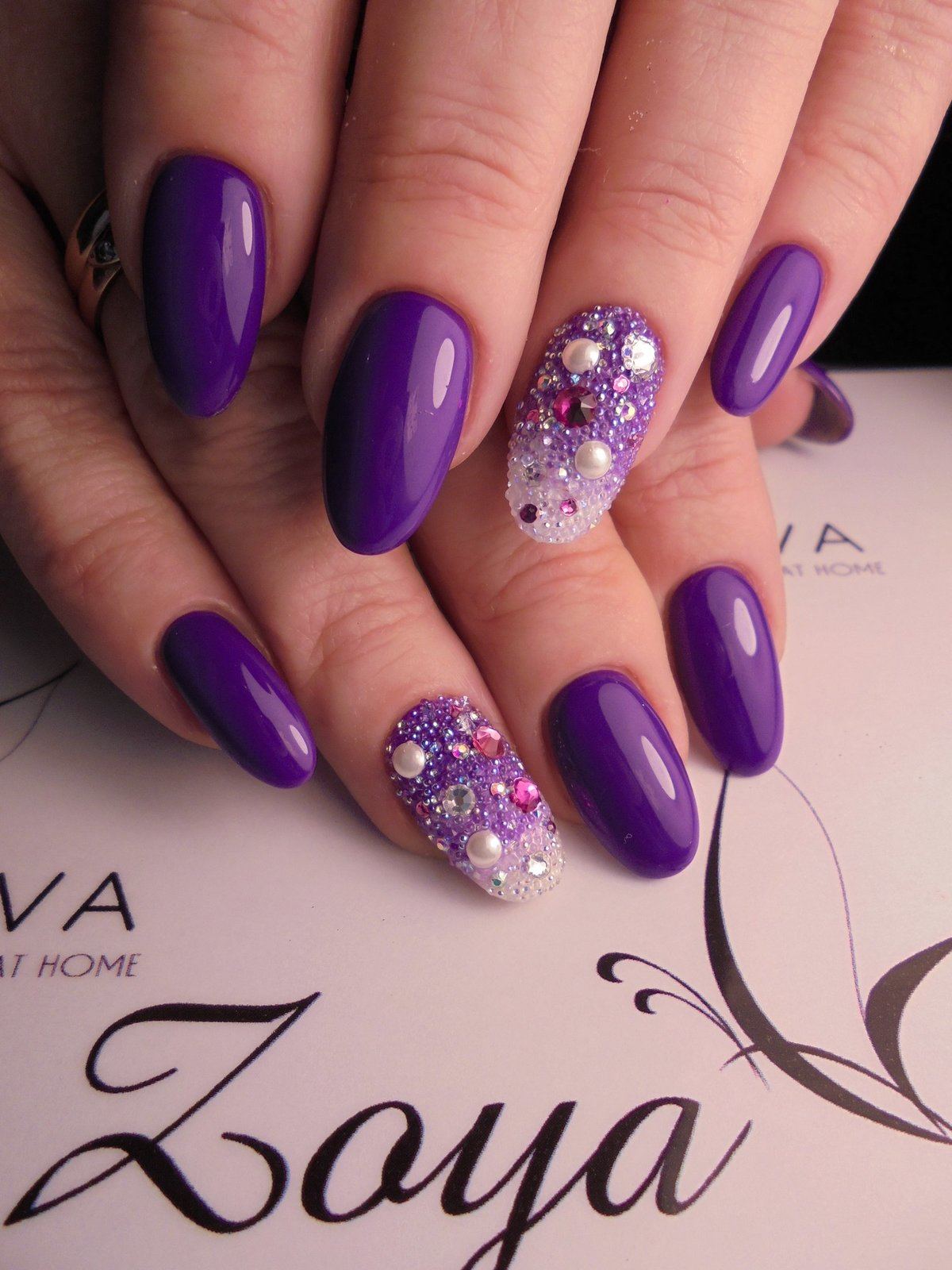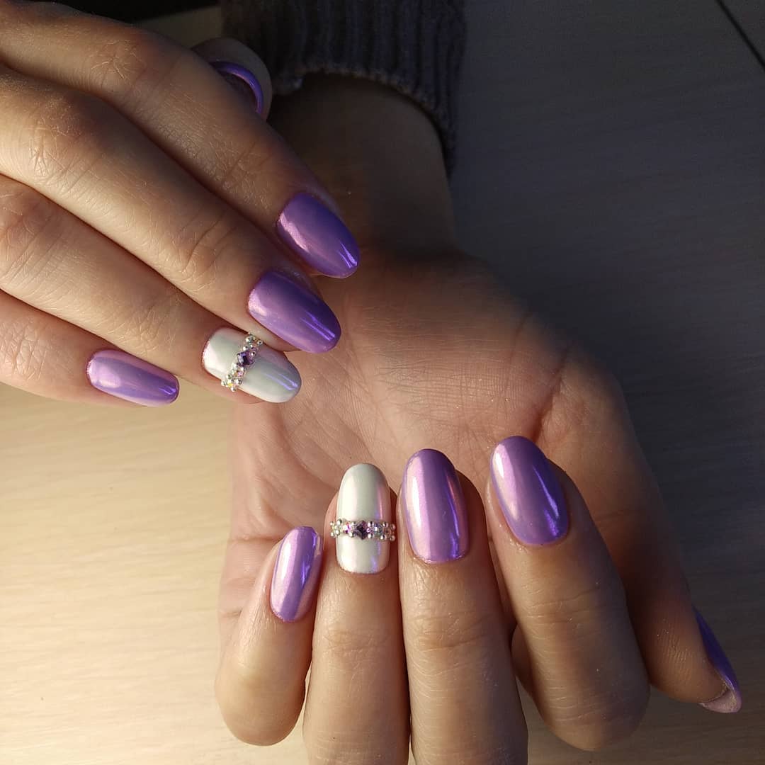 Стразы лучше выбрать разного размера, чтобы хорошо выглядели на длинных ногтях. Не менее актуален бело-лиловый градиент, выполненный с использованием глянцевого покрытия. Декор не нужен – одинаковое окрашивание на всех ногтях его не предполагает.