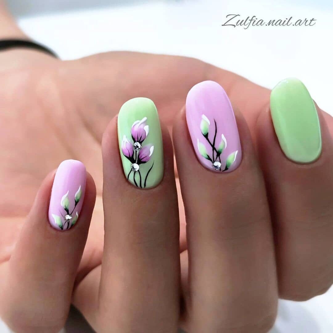 В 2021 году сочетайте цветы и зелень с нейтральным базовым слоем, чтобы создать этот красивый дизайн ногтей, вдохновленный природой. Вы можете выбрать любой понравившийся цветок, в любом цветовом сочетании. Мягкие зеленые листья добавляют образу и создают баланс, как в букете цветов. Однако, если вы не уверены, что ваши навыки рисования подходят для этого, попробуйте создать этот дизайн с помощью трафарета, или выберите наклейки для ногтей (стемпинг).