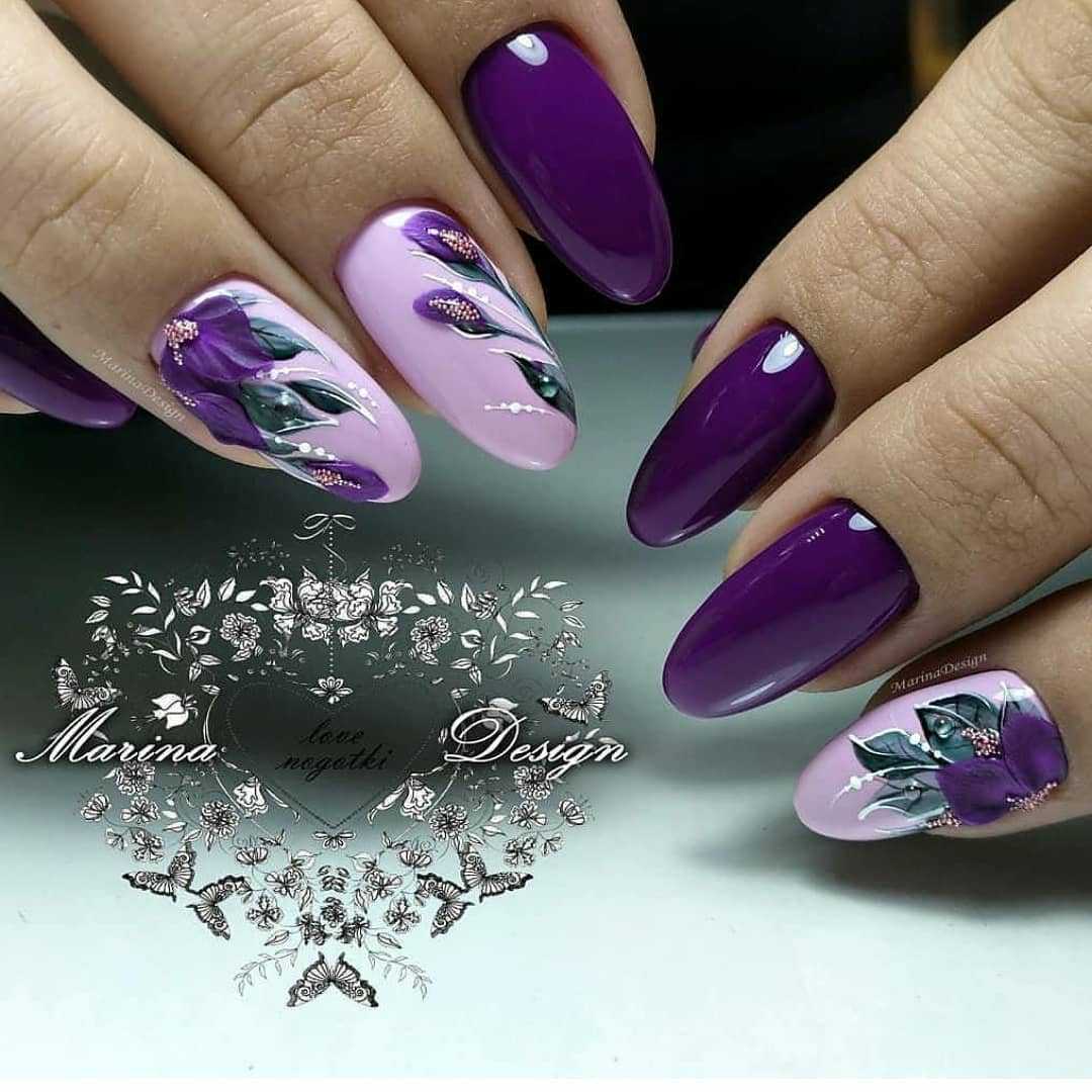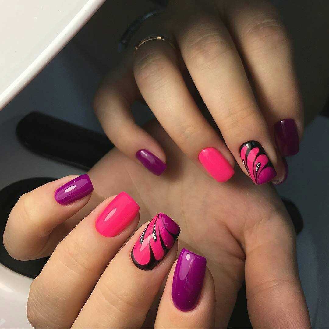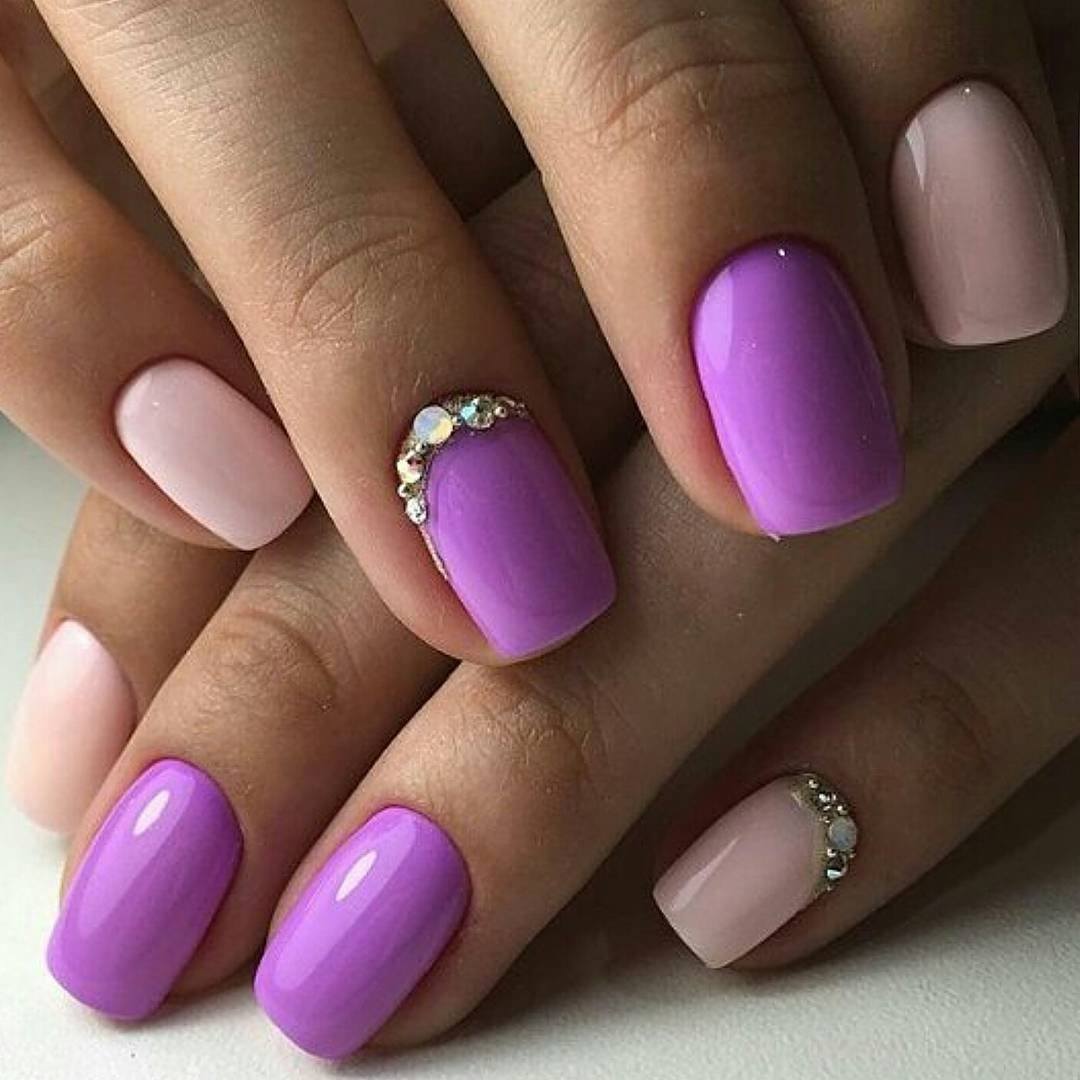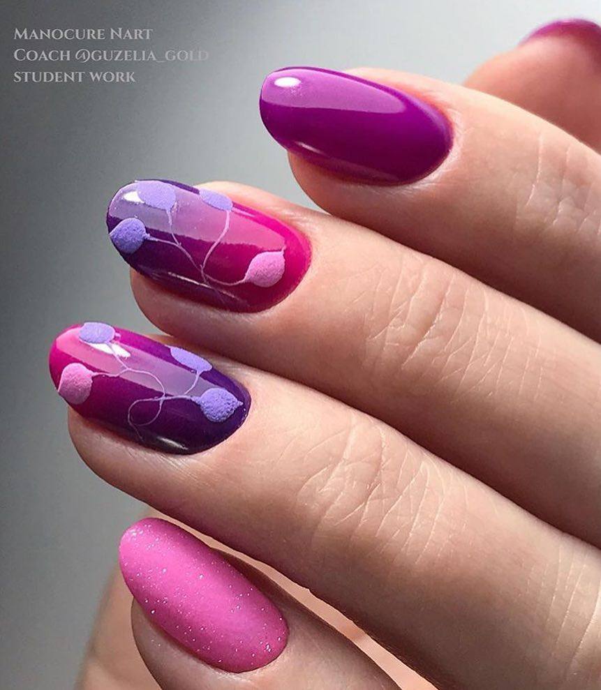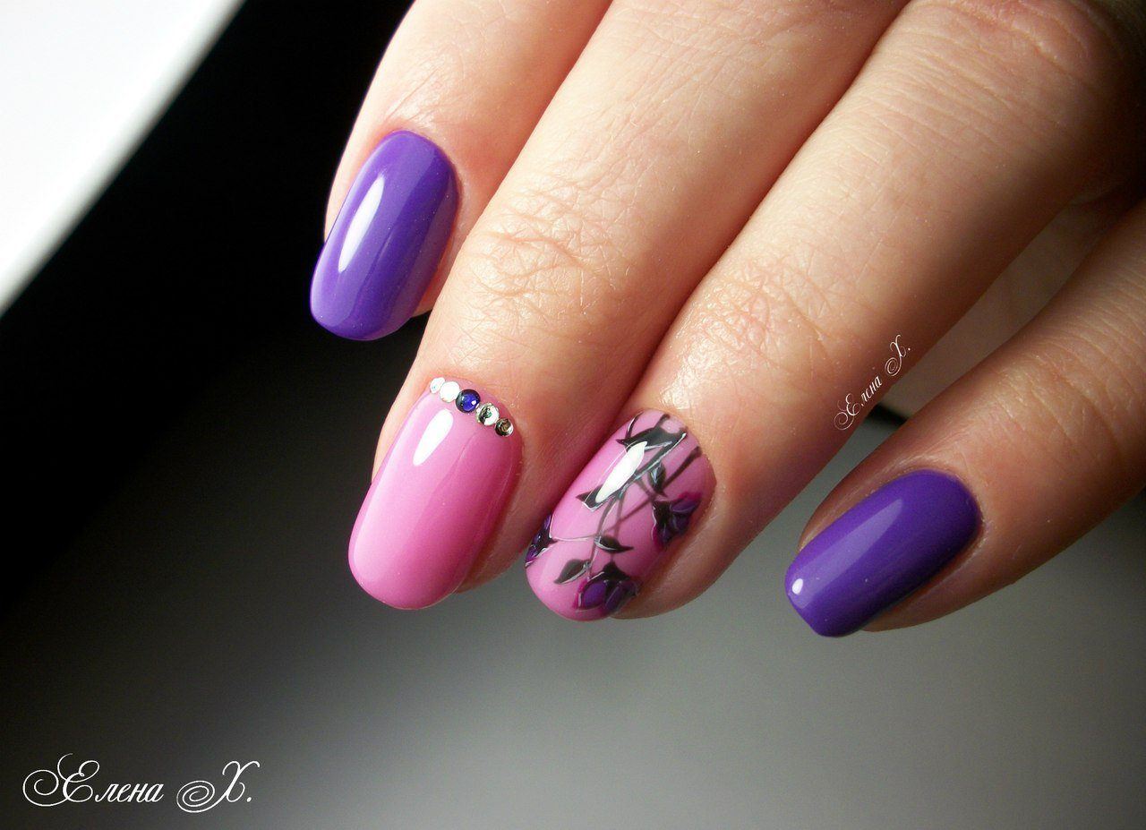 Розовый и фиолетовый – схожие по колористике тона, которые великолепно смотрятся в одном тандеме. Дизайн в этих тонах получается очень нежным и воздушным. Такие нейл-арты чаще всего дополняют весенние и летние образы.