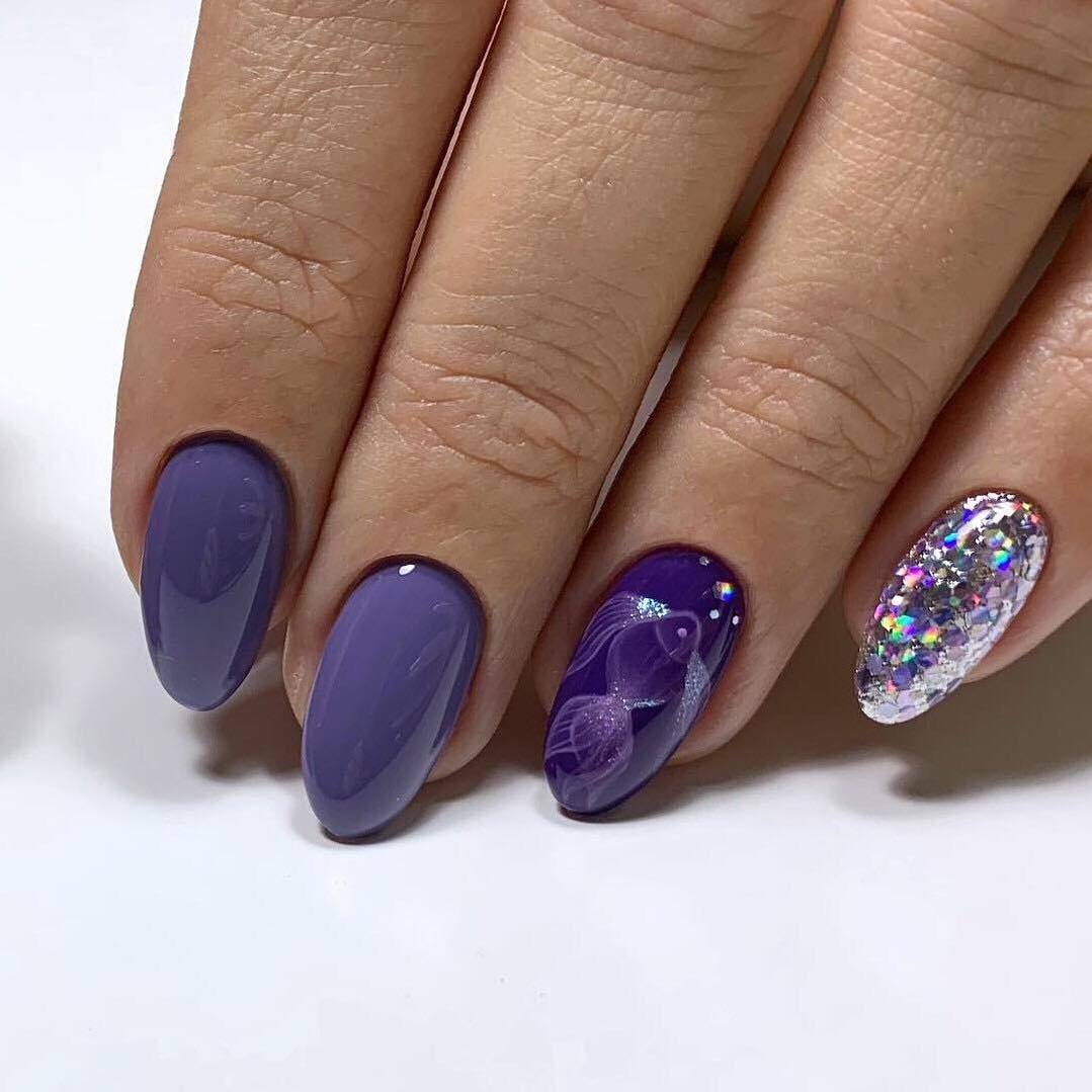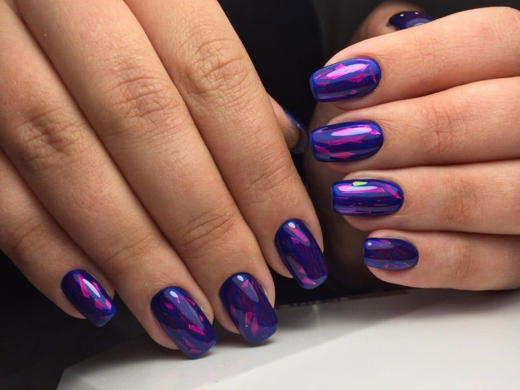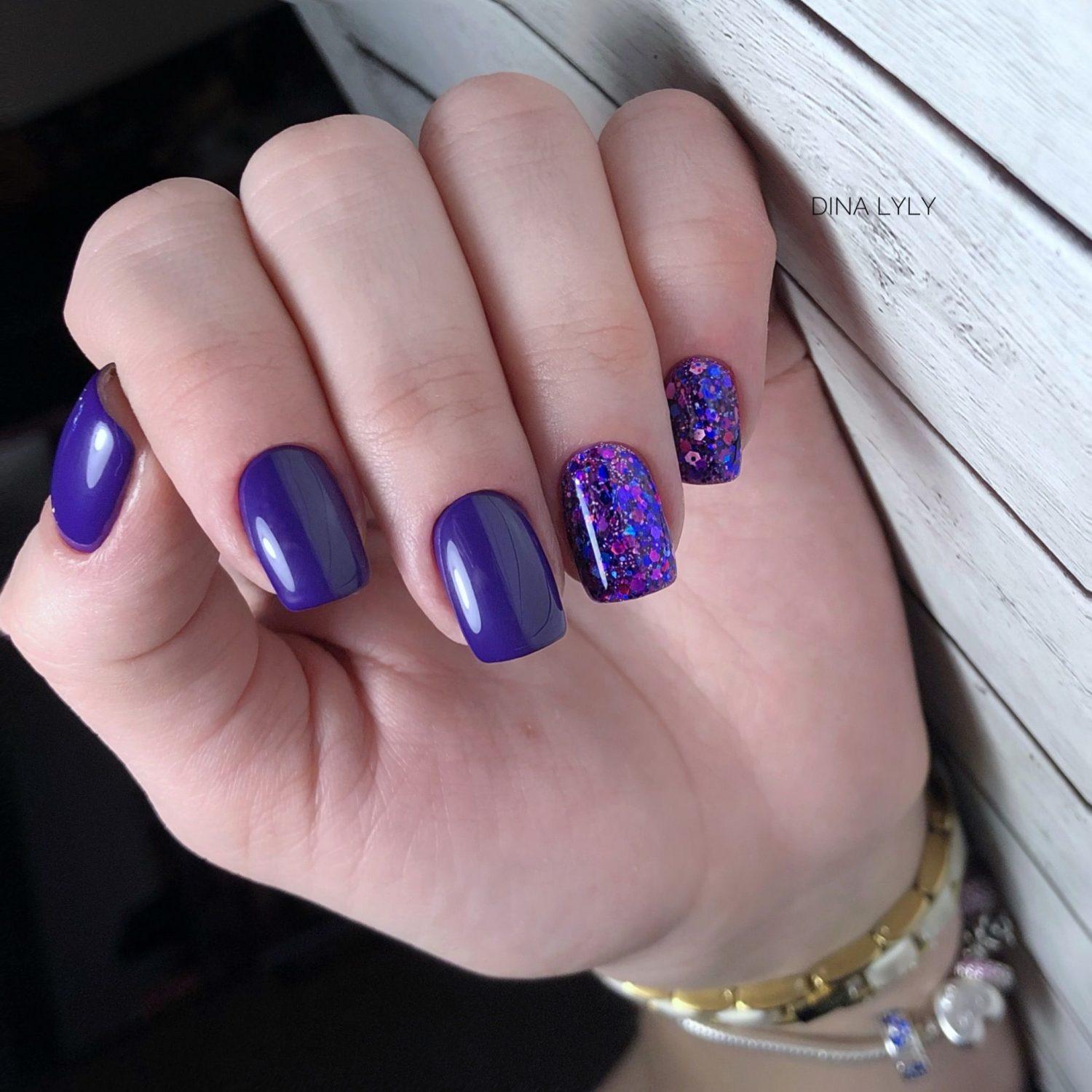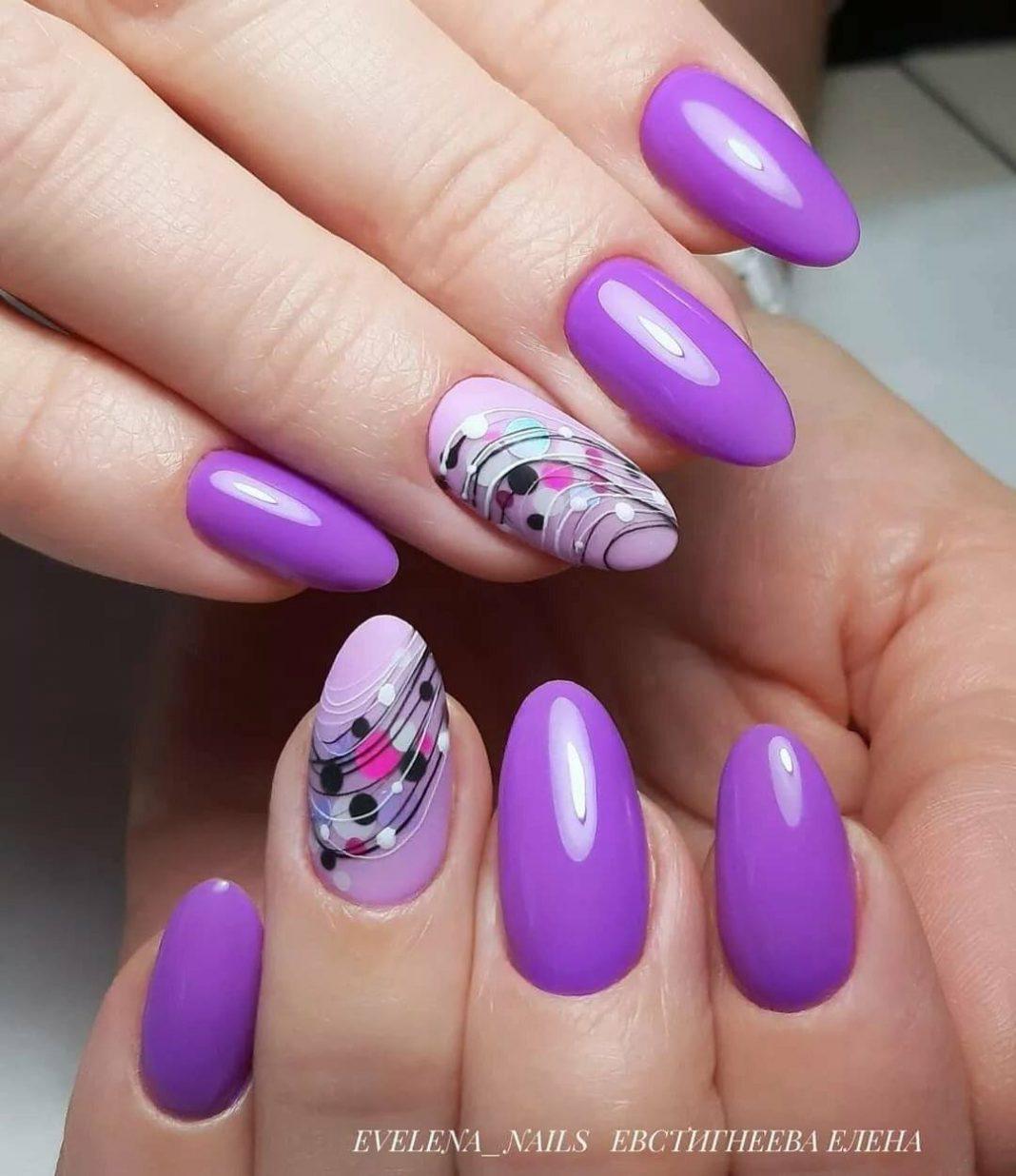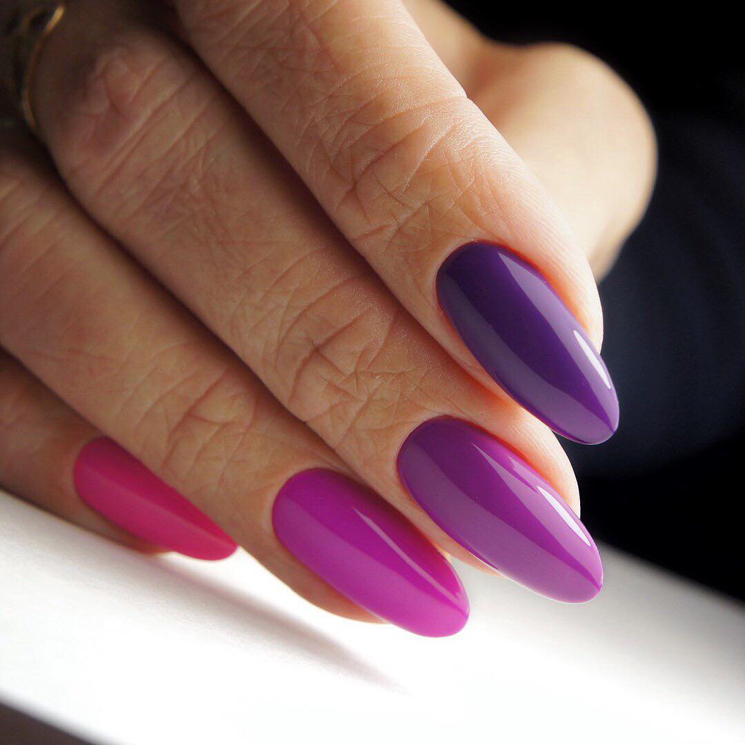 Фиолетовый. Этот цвет считается более уместным для нарощенных ногтей, нежели синий. Оригинально выглядят сливовый, сиреневый, пурпурный и оттенок индиго.