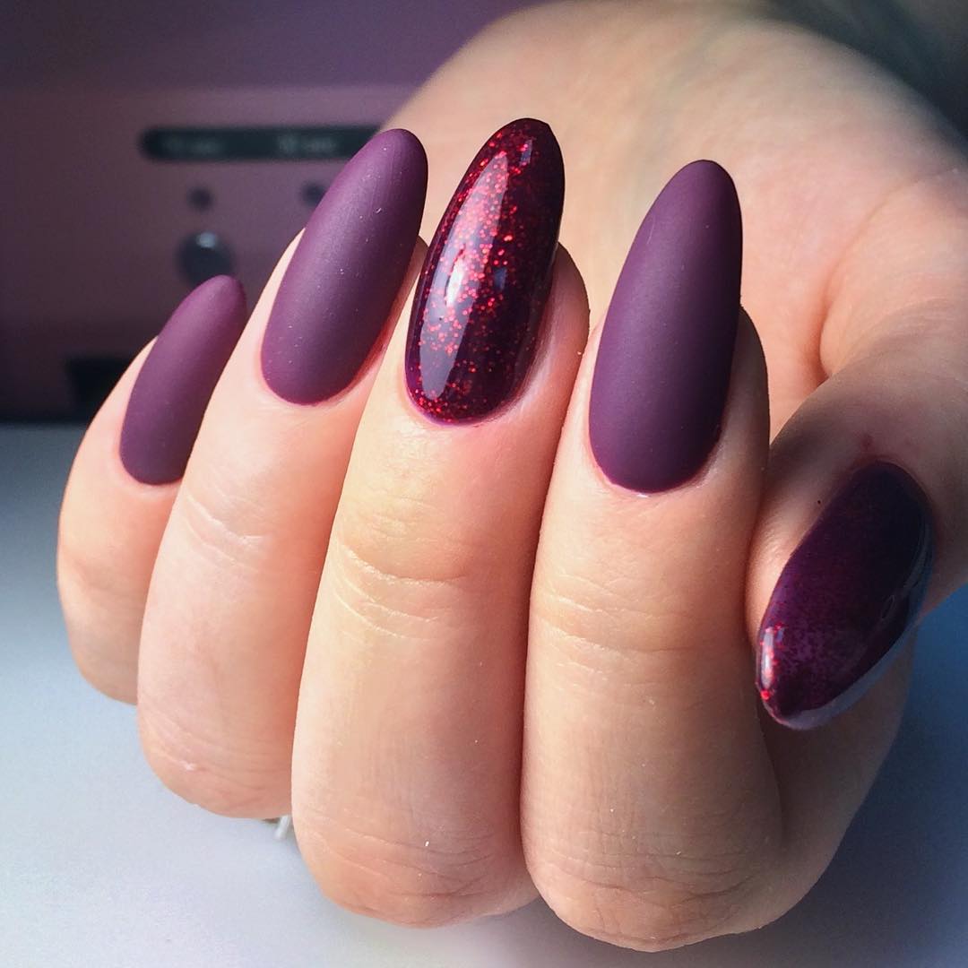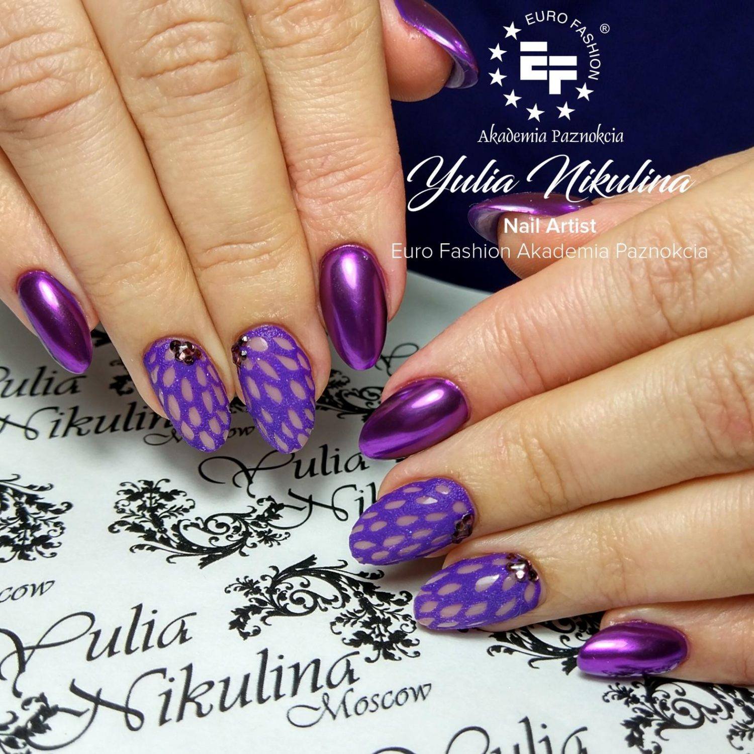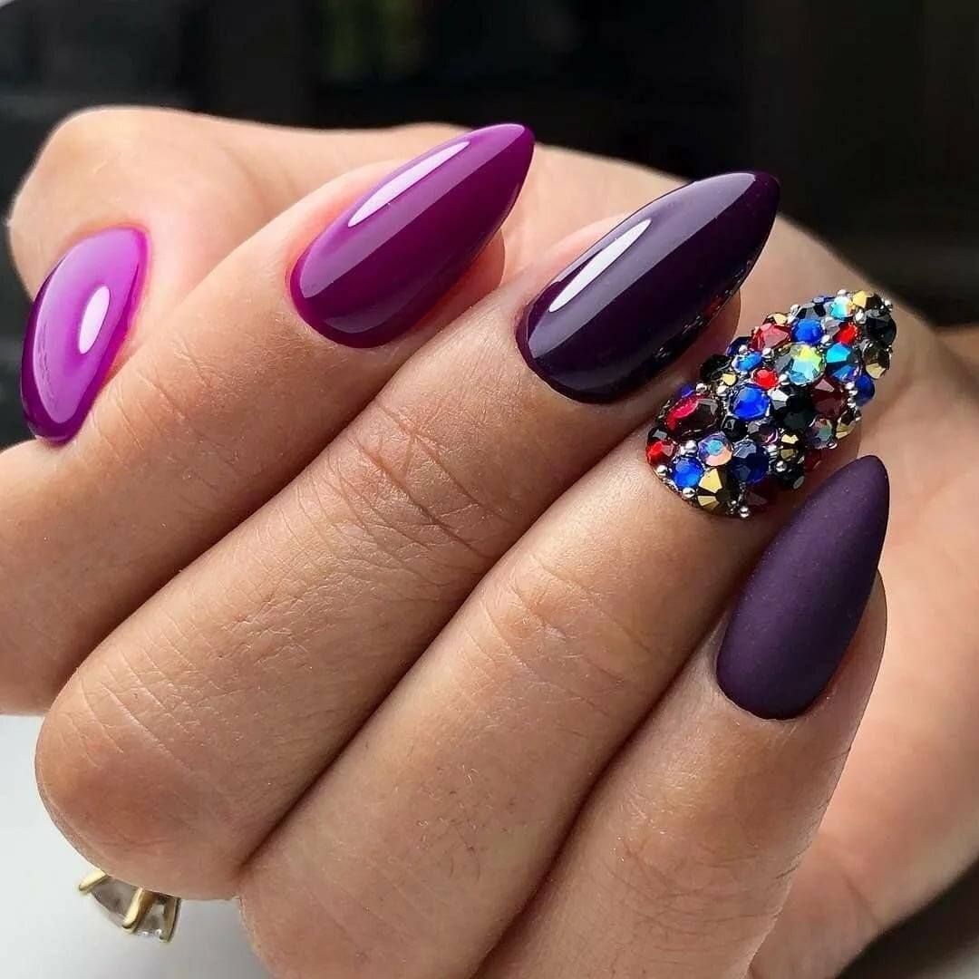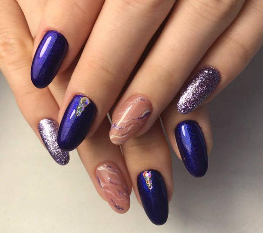 Фиолетовый. Этот цвет считается более уместным для нарощенных ногтей, нежели синий. Оригинально выглядят сливовый, сиреневый, пурпурный и оттенок индиго.