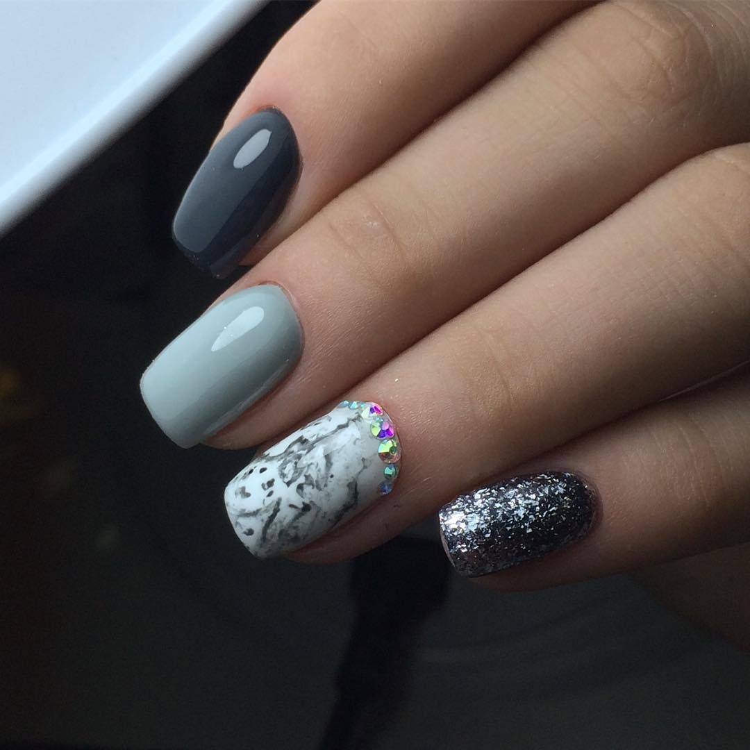 Мраморный дизайн вмиг пришелся по вкусу всем девушкам. Тонкие, еле заметные линии создают имитацию природного камня. На ноготках такой рисунок выглядит особенно оригинально. К тому же, в данном случае не имеет значения их длина и форма. Наиболее часто девушки выбирают данный нейл-арт в черном, синем, розовом, сером, зеленом или графитовом оттенке. Каждый из них смотрится по-своему интересно.