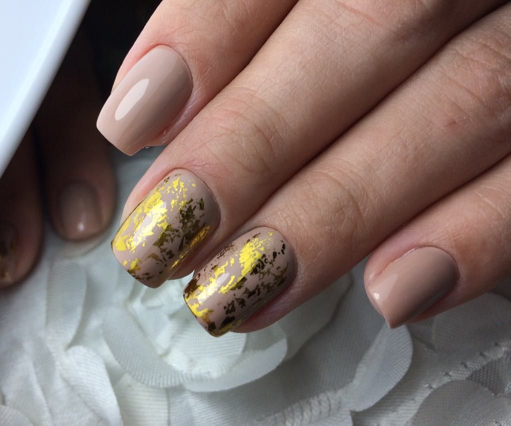 осенние листочки, тронутые желтизной, украсят нюдовый или светло-бежевый маникюр;