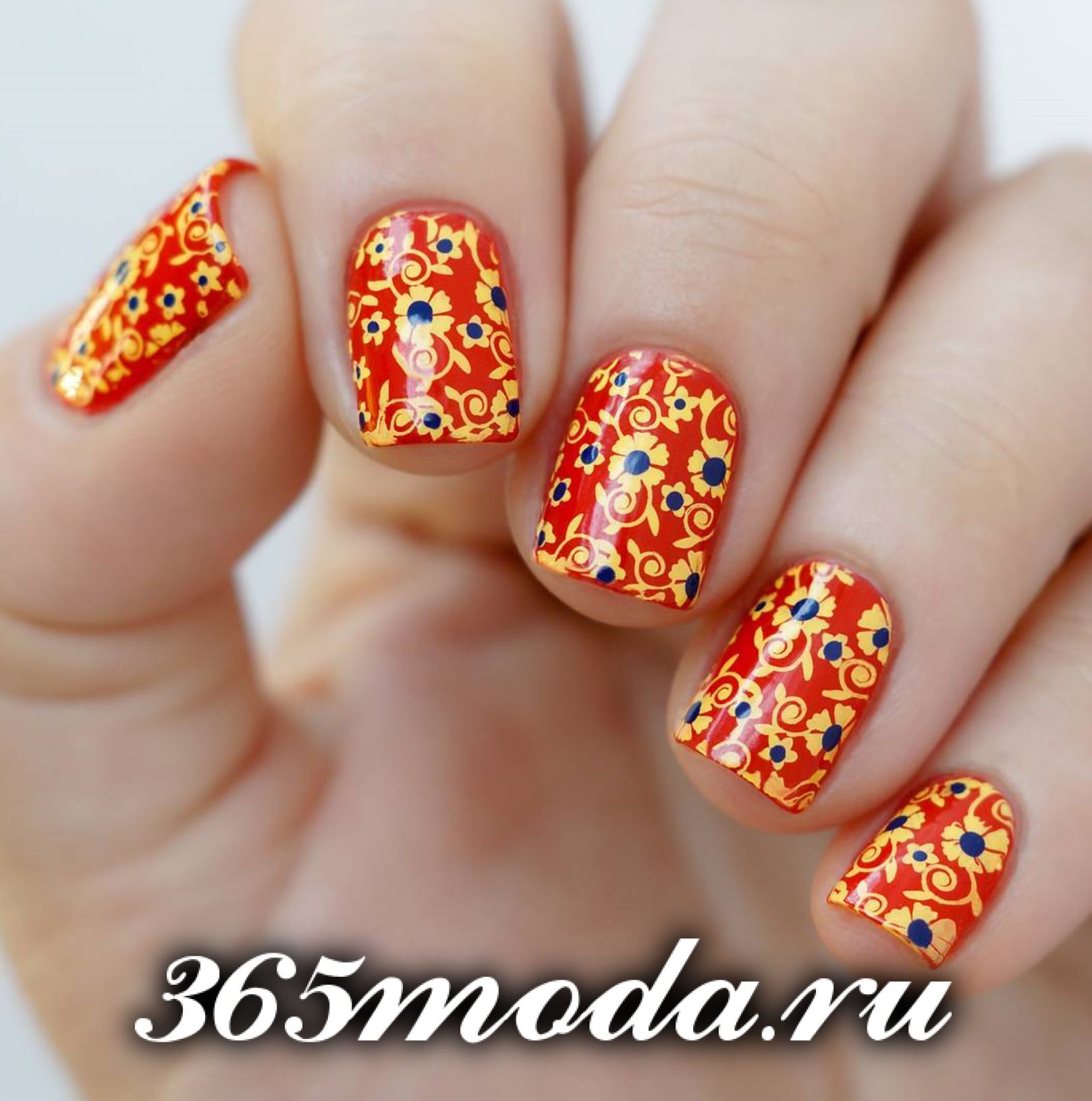 Зачастую такой маникюр делают в красно-оранжевой гамме, поэтому дизайн всегда привлекает внимание. Уместными в данном случае будут и нейтральные оттенки