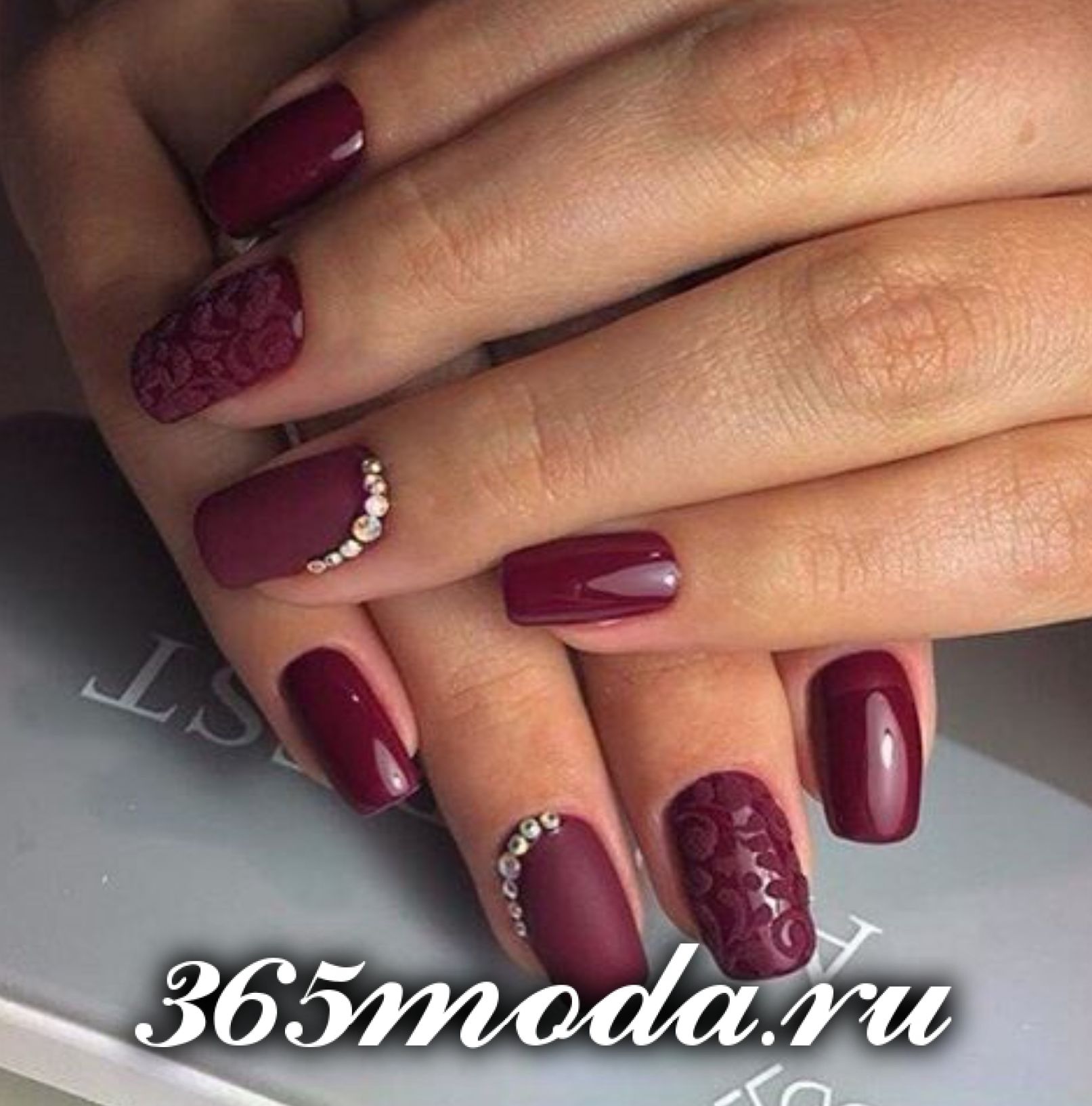 Для осенне-зимнего периода одним из наиболее актуальных маникюров, является матовый. Он делается либо с помощью специального матирующего финишного покрытия, либо матирующего лака. Лучше всего такое покрытие смотрится с такими цветами: красный, бордо, сливовый, шоколадный, синий, дымчато-серый, бежевый и т.д.
