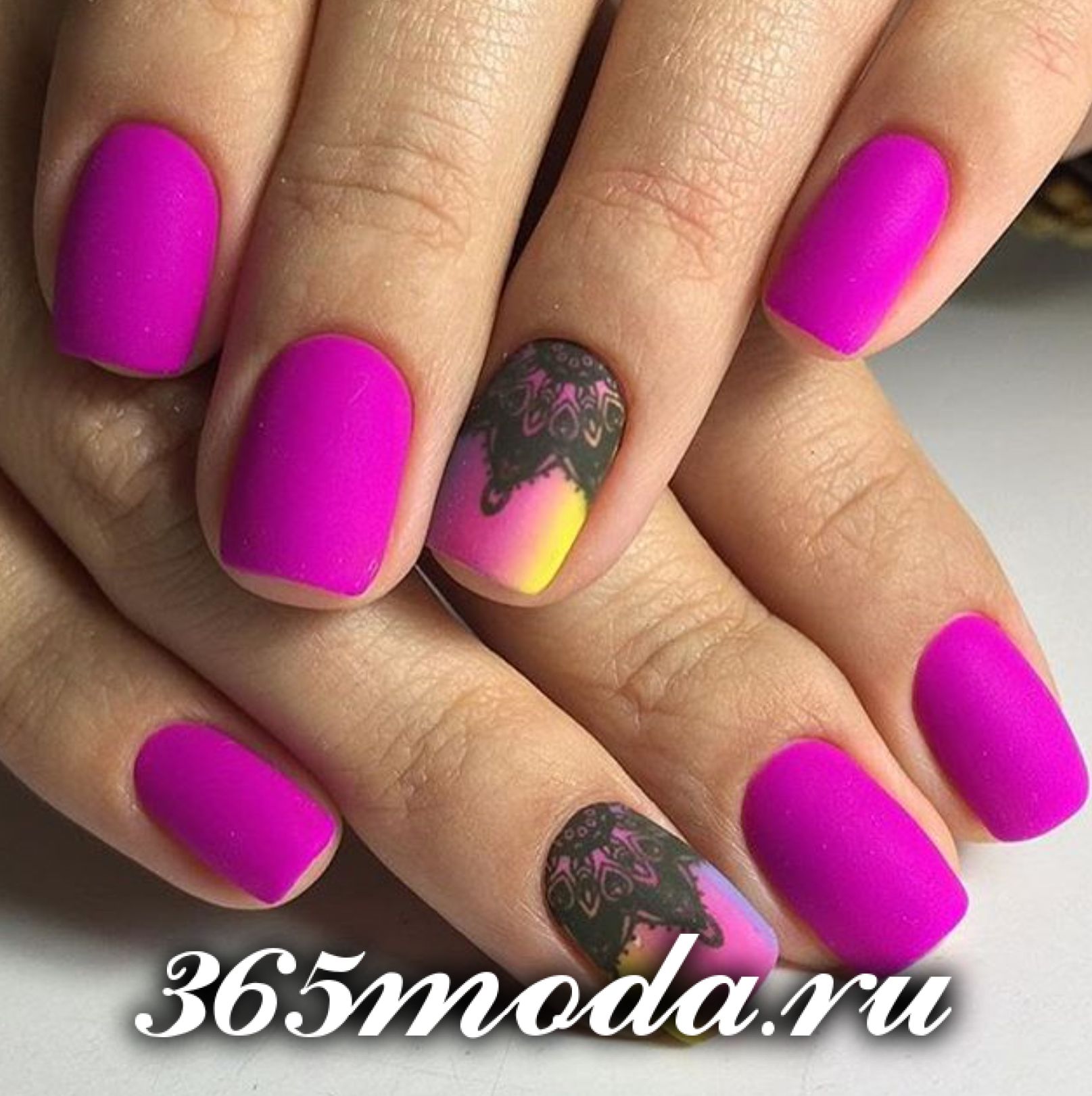 Особенно эффектно выглядит сочетание матовой поверхности с глянцевой или шиммерной. А если вы хотите чего-то необычного, попробуйте матовый маникюр с дизайном «бархатный песок». Можно делать различные узоры, цветы, улыбку френча или, например, «вязанный дизайн». Так что если вам надоело глянцевое и блестящее покрытие, смело пробуйте матовое.