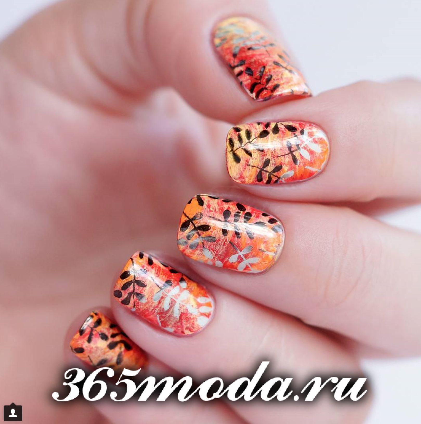 Достаточно сделать по 2 ногтя градиентными на каждой руке, а на оставшиеся ногти нанести рисунки осенней листвы.