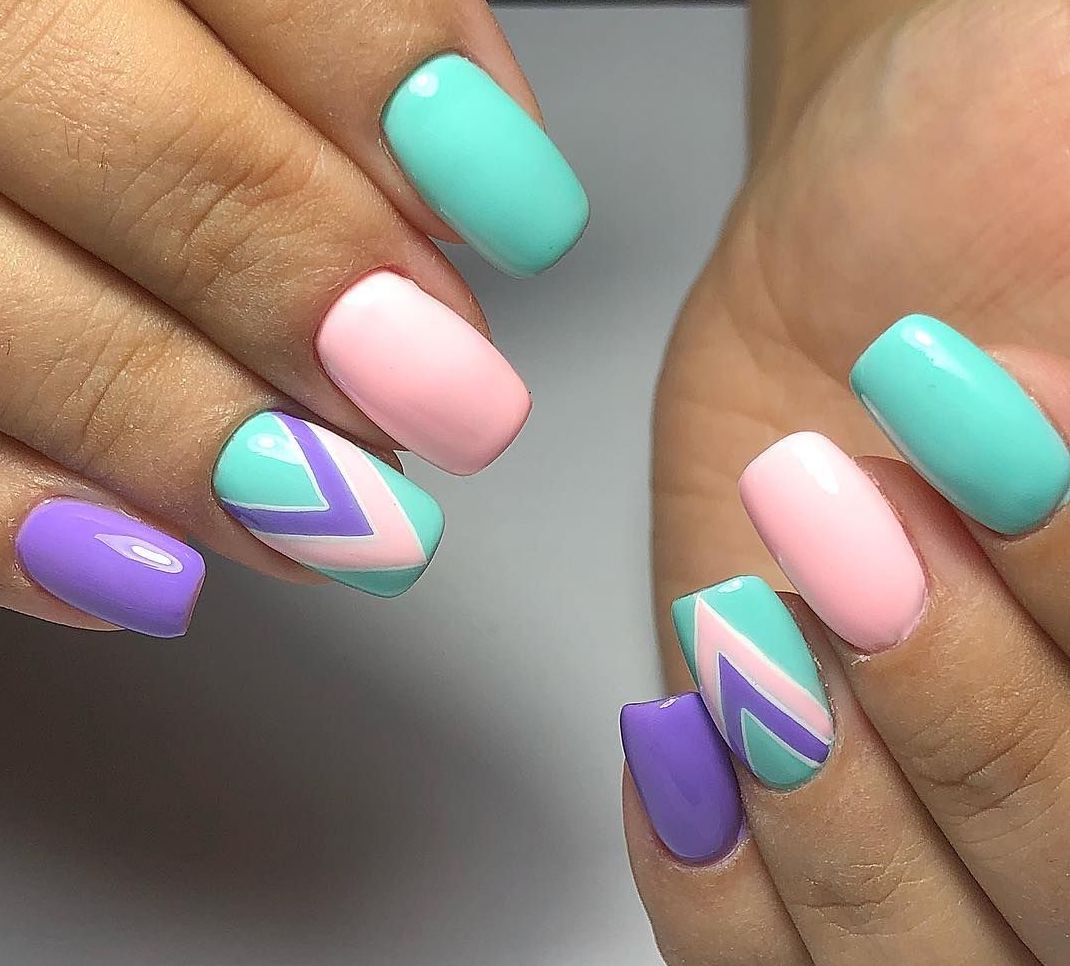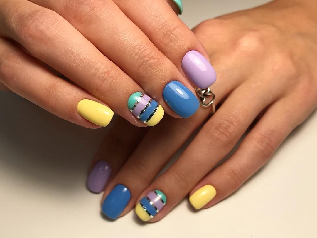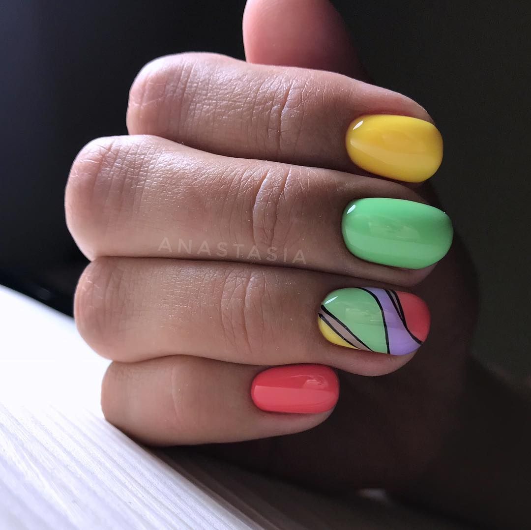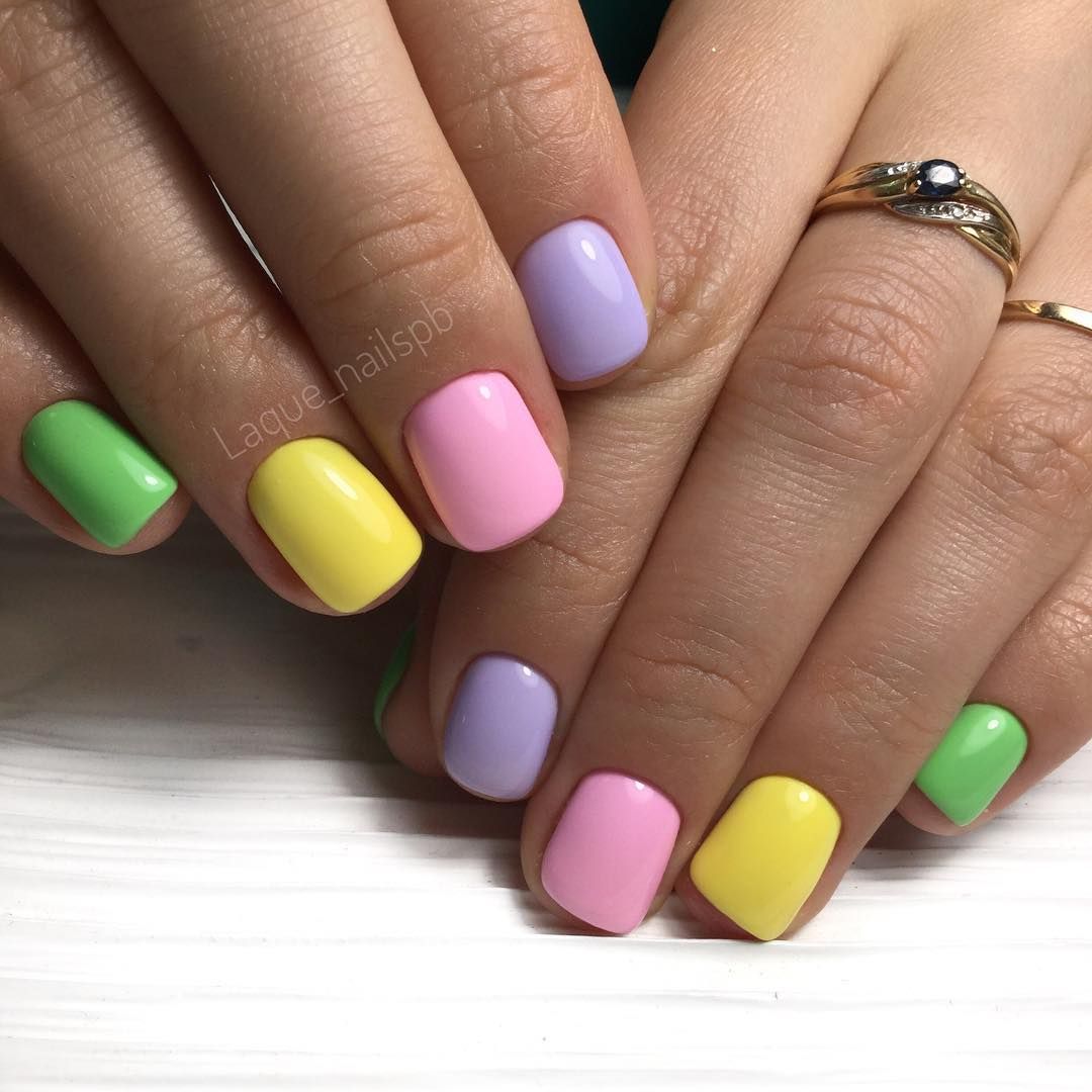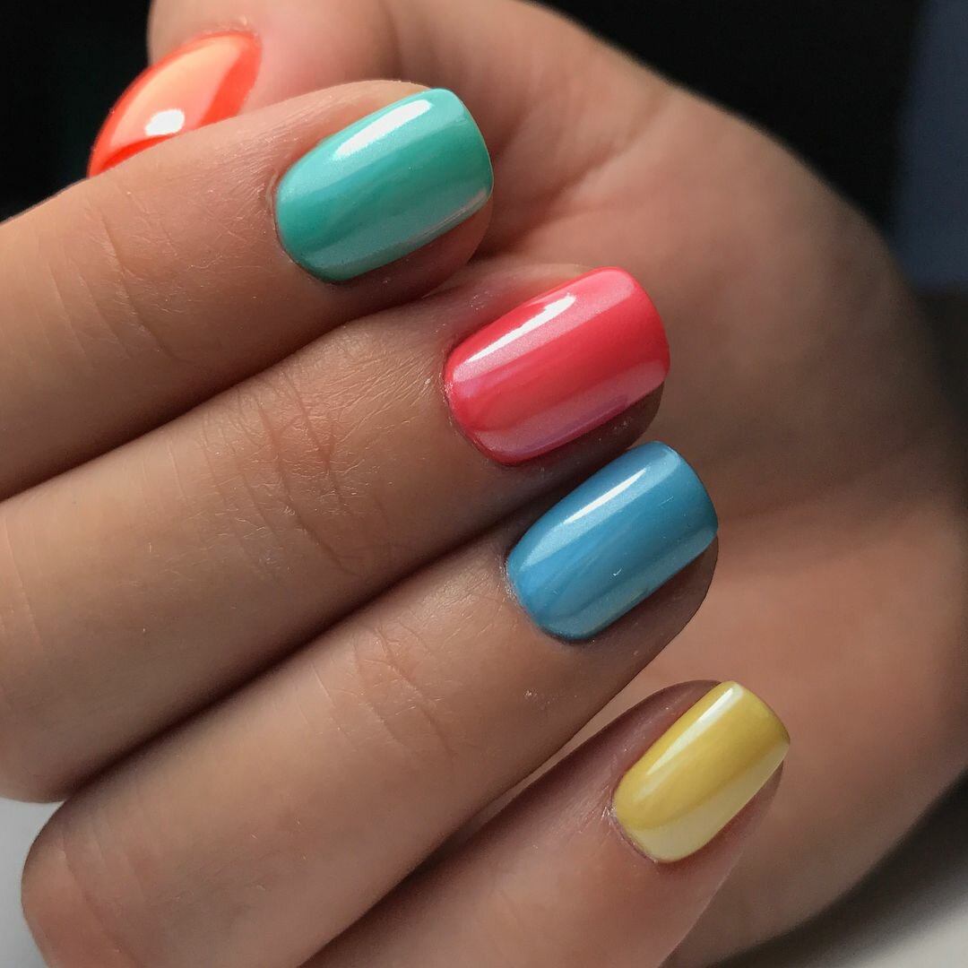 Разноцветный маникюр стал очень популярным благодаря своей универсальности. Каждая модница без труда подберёт аксессуары и одежду для таких ноготков. В грамотном исполнении такой маникюр легко вписывается в самый строгий дресс-код, или смело подчеркнёт ваше яркое настроение в любую погоду. Спешим выбирать оттенки!