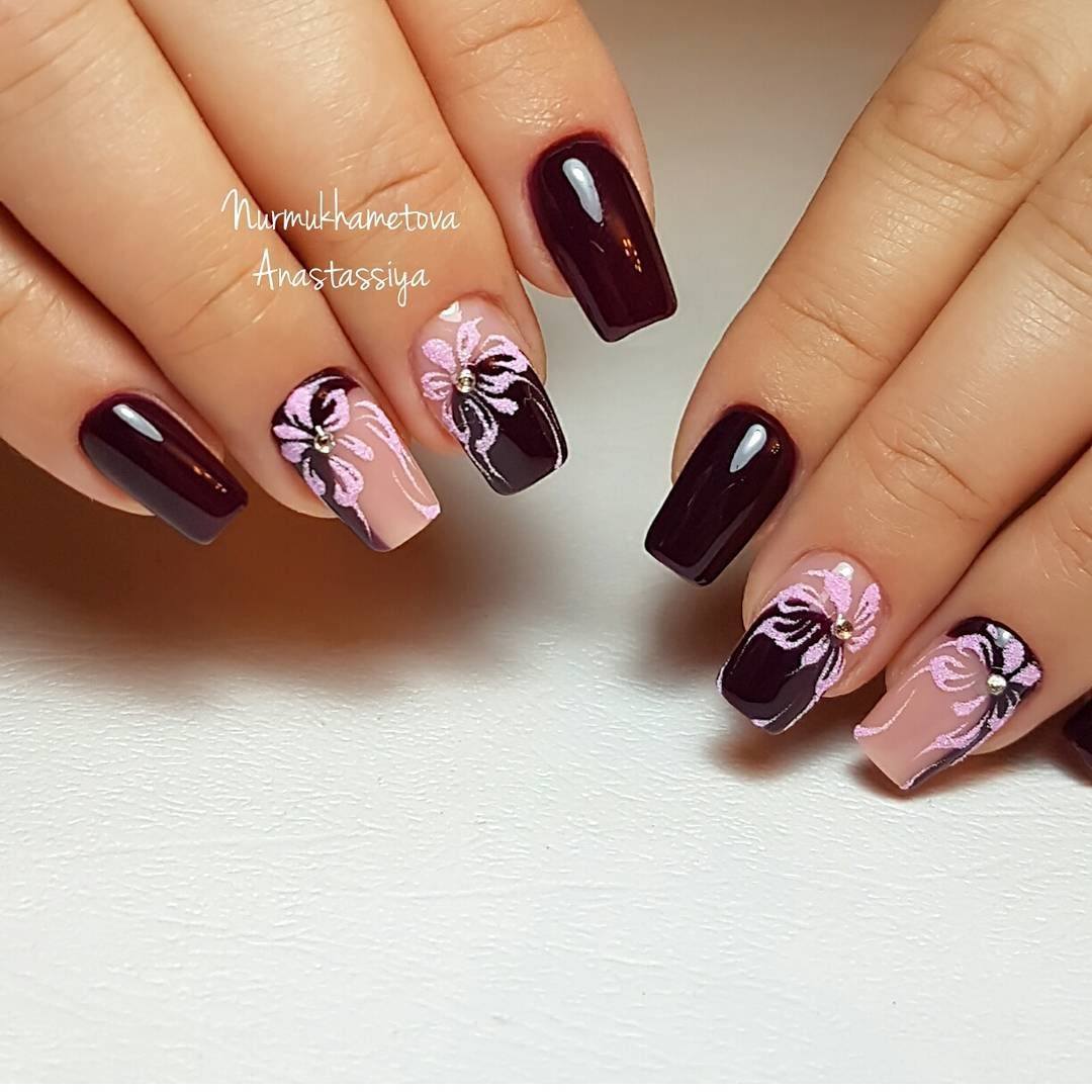 - Темный маникюр с цветами и веточками — это оригинальный тренд в маникюре для весенне-летнего сезона. Листочки и веточки, цветы, абстрактные завитки и узоры украсят ваш темный маникюр в этом сезоне.