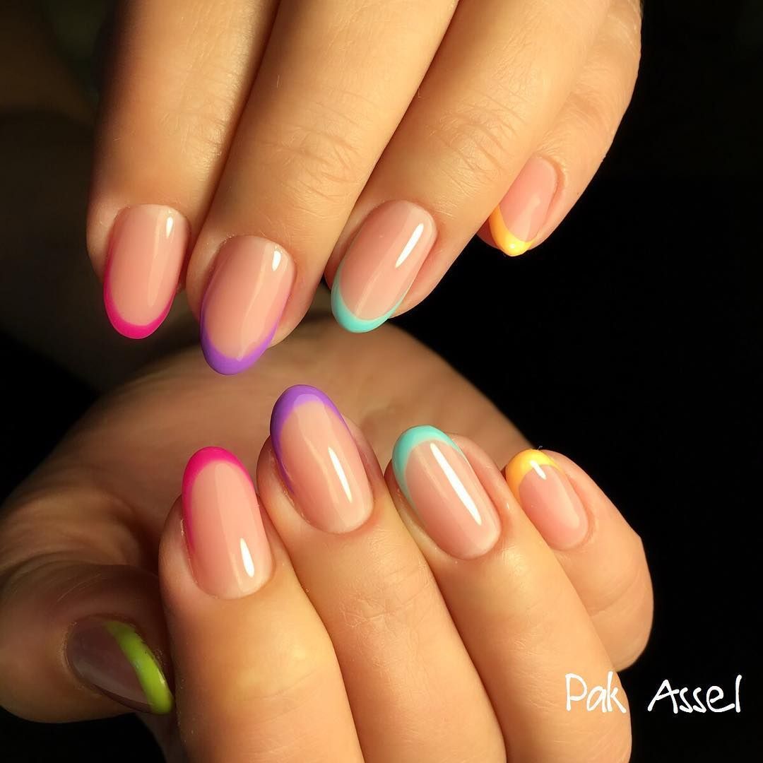 Рискните выделить полоску френча одним из насыщенных неоновых оттенков, или отдайте предпочтение разноцветным ногтям. Очень необычно, красиво и модно. Выполнение френча цветными полосами или горошками, совмещение, как кажется совсем разных, цветовых решений, как раз и внесёт в классический вариант знаменитого френча, ту самую яркую нотку.