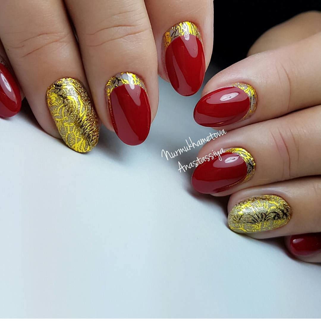 Также, популярна радужная и золотистая втирка в сочетании с красными ноготками.