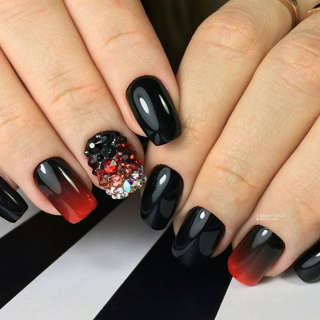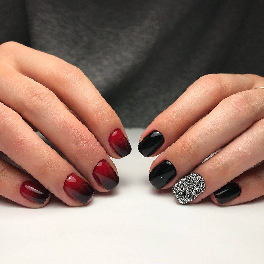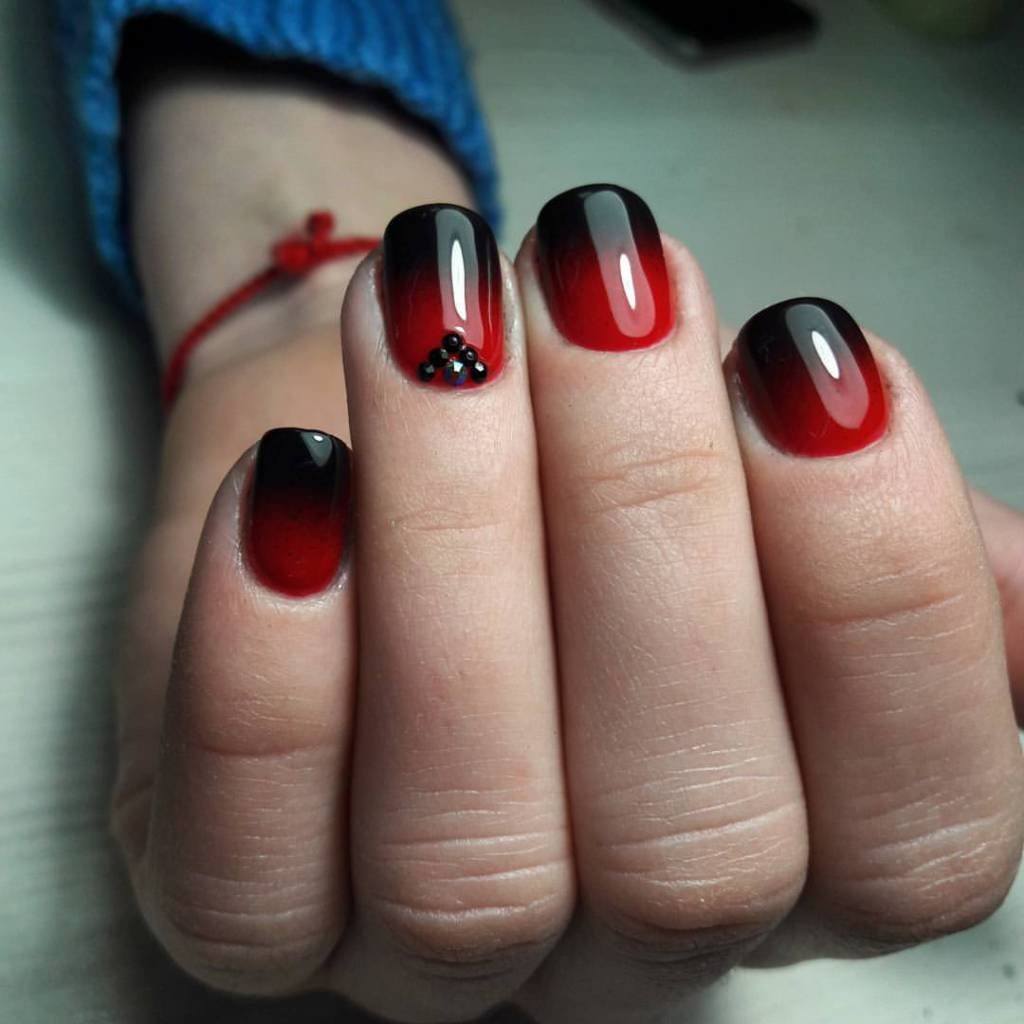 Маникюр омбре великолепно выглядит как на коротких, так и на длинных ноготках. Причем можно использовать 2 и более оттенка, которые плавно осветляются к краю ногтевой пластины. Что касается черно-красного маникюра, то здесь стоит использовать красный с краю ногтя, а черным закрашивать остальное пространство.