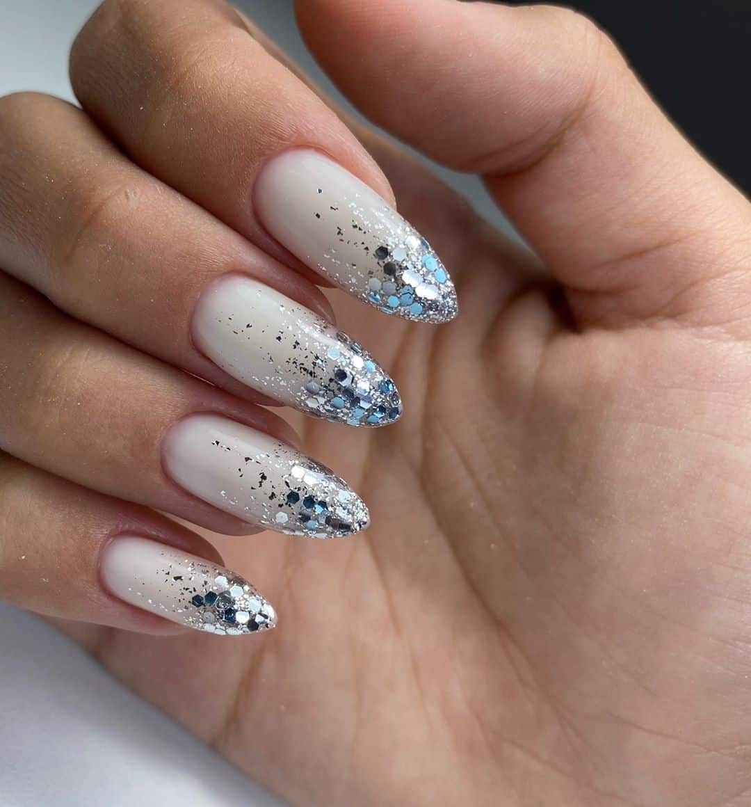 Создавать рисунок можно при помощи двух, трех или даже четырех цветов. Весьма стильный маникюр получится, если в качестве оттенка компаньона воспользоваться рассыпчатыми блестками, создав с их помощью покрытие разной плотности.