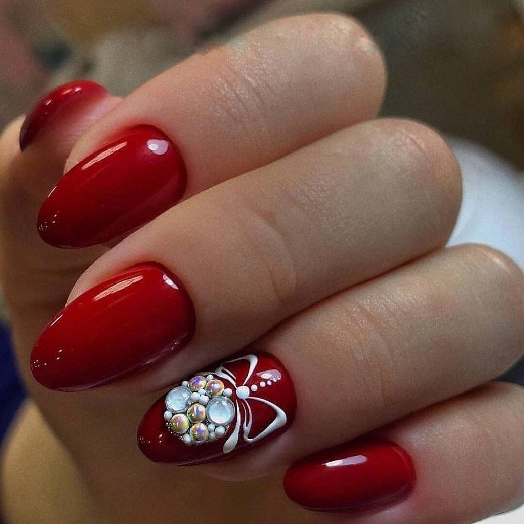 Для обладательниц коротких или очень коротких ноготков, подойдет красный дизайн с небольшим количеством блесток или страз, или с аккуратным рисунком на одном или двух ноготках.