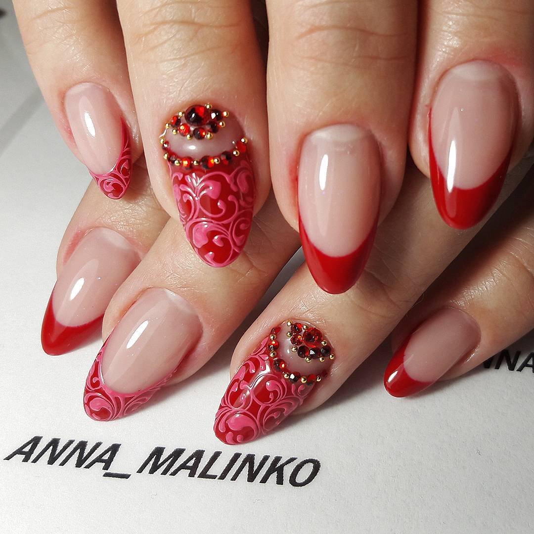 Разнообразные ажурные узоры на красном фоне выглядят невероятно красиво, нежно. Это идеальный вариант для тех, кто не желает привязывать образ к какому-то определенному рисунку. Тем более, что такие узоры можно сделать самостоятельно в домашних условиях. В основном для этого используют тонкую кисть и краски или же лак необходимого цвета. Стразы в данном случае выполняют роль акцента. Но это касается небольшого количества таких деталей.