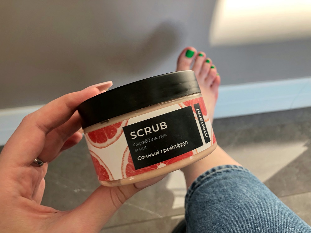 Нанесите на кожу ног скраб, уделяя особое внимание пяткам. Остатки средства смойте теплой водой