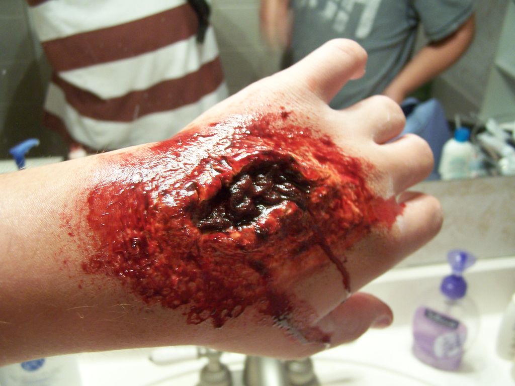 Кетчуп плохо сохнет и очень течет; красная краска, если это не грим, смотрится бледновато и ненатурально. Можно сварить подкрашенный пищевым красителем густой сироп и нанести его (но не забудьте сделать его скорее бордовым по цвету); он, однако, хотя и выглядит неплохо, будет ощущаться на коже и стягивать ее, особенно в первые часы.