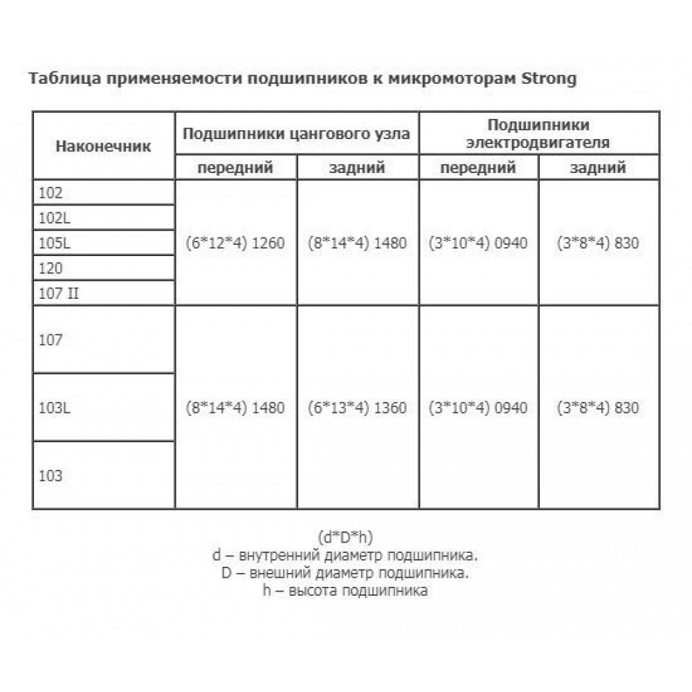 Доставка по России, Казахстану, Беларусь Выбираем лучшие товары для Вас Мы на связи и быстро ответим на WhatsApp Набор подшипников для аппарата Strong.Наиболее уязвимой и быстро выходящей из строя деталей в маникюрной машинке являются подшипники и карбоновые щетки. Материал по которому работает мастер. Не своевременное обслуживание и очистка. Ручка фрезера выходит из строя, начинает греться, появляется лишний шум, стук. При данным симптомах необходимо провести осмотр фрезера, разобрав его на детали. Данный набор подшипников включает 4 шт. Передний (на цангу) 1260 D=12, d=6, h=4 Задний (на цангу) 1480 D=14, d=8, h=4. Передний (на ротор) 0940 D=9, d=4, h=4. Задний (на ротор) 0830 D=8, d=3, h=4. d – внутренний диаметр подшипника. D – внешний диаметр подшипника. Подходит для следующих аппаратов: Для наконечника аппарата Strong 90, 204, 102L, 105L, 120, 107 II, Marathon, Saeyang. Предлагаем запчасти для маникюрных аппаратов с доставкой по России из Екатеринбурга. Источник Не продаем подшипники из Китая или какую либо некондицию, т.е. с какими либо отклонениями от параметров. | |||||||||||||||||||||||||||||||||||||||