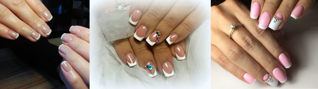 Французский маникюр со стразами. Самый универсальный дизайн. Всегда смотрится уместно и аккуратно. Камушки сделают дополнительный акцент на крае ногтя. Чаще всего используются некрупные украшения.