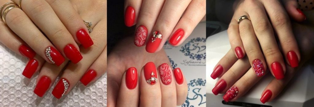 Красный маникюр со стразами — красивый вариант вечернего маникюра. Выбрать можно лак любой степени яркости, использовать стразы в любых количествах. Выложить камни можно: линией, точечно или фигурками на свой вкус.