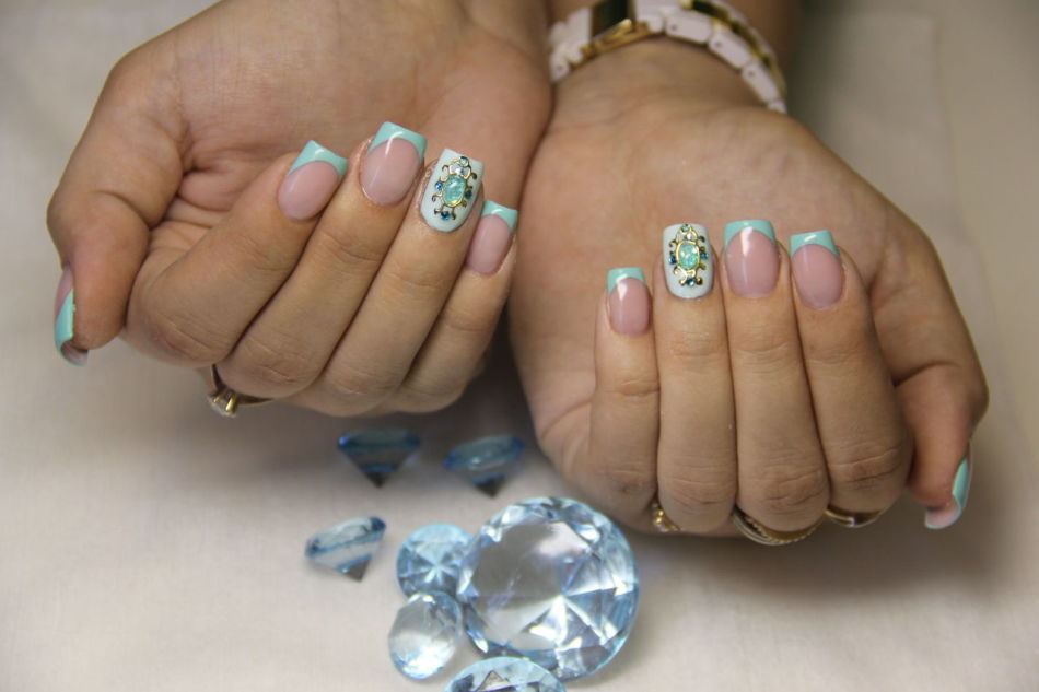Бирюзовый цвет остается на пике популярности вот уже несколько лет к ряду. Этого цвета женщины стараются придерживаться не только в одежде и макияже, но и в маникюре. Ногти бирюзового цвета — хит теплого времени года, так как навеивают ассоциации теплого лазурного моря, прохлады, мятного мохито и дарят необычайное спокойствие. Бирюзовый маникюр может быть как полный, так и в виде френча. Такой цвет часто украшают камнями для того, чтобы придать маникюру особой нарядности и праздничности.