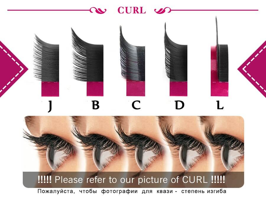 - “L” — самый сильный загиб, имеющий прямое основание и заметно закрученный кончик. Изгиб “L” не подходит слабым и редким ресницам.