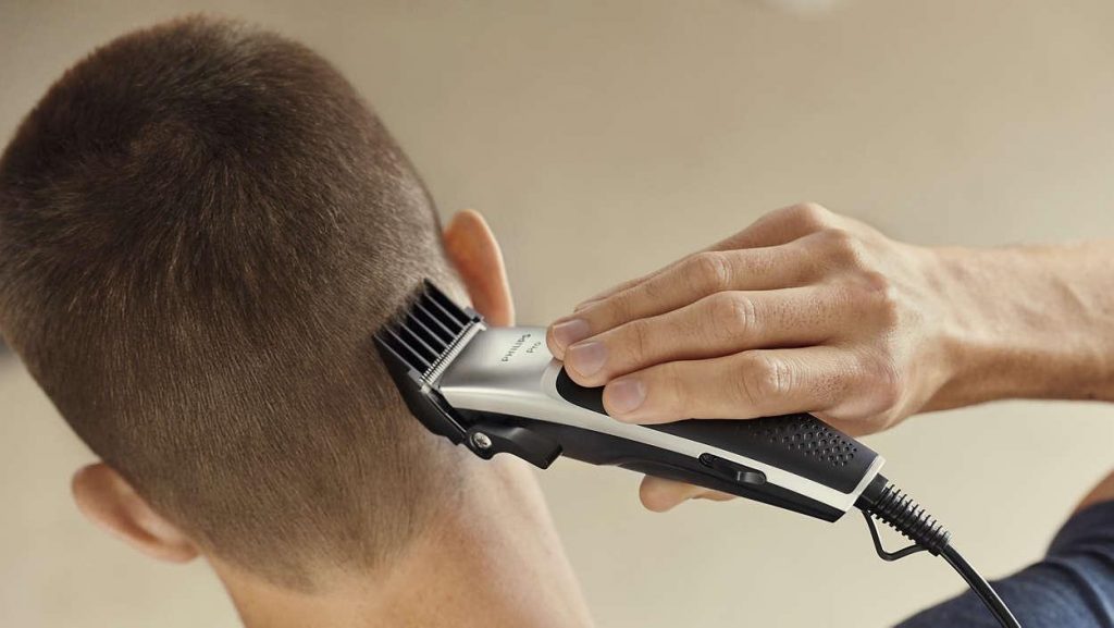 - Установите на машинку насадку «минус» и удалите ею все волосы на висках.