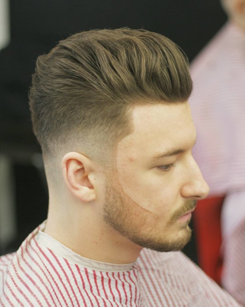 Если рассмотреть фото стрижки со всех сторон, то можно заметить, что перепад длины действительно очень ощутимый, не плавный (за плавным переходом – к стрижке фейд). Именно благодаря этому приему и достигается главный эффект стрижки: ее обладатель мгновенно начинает выглядеть стильно и брутально.
