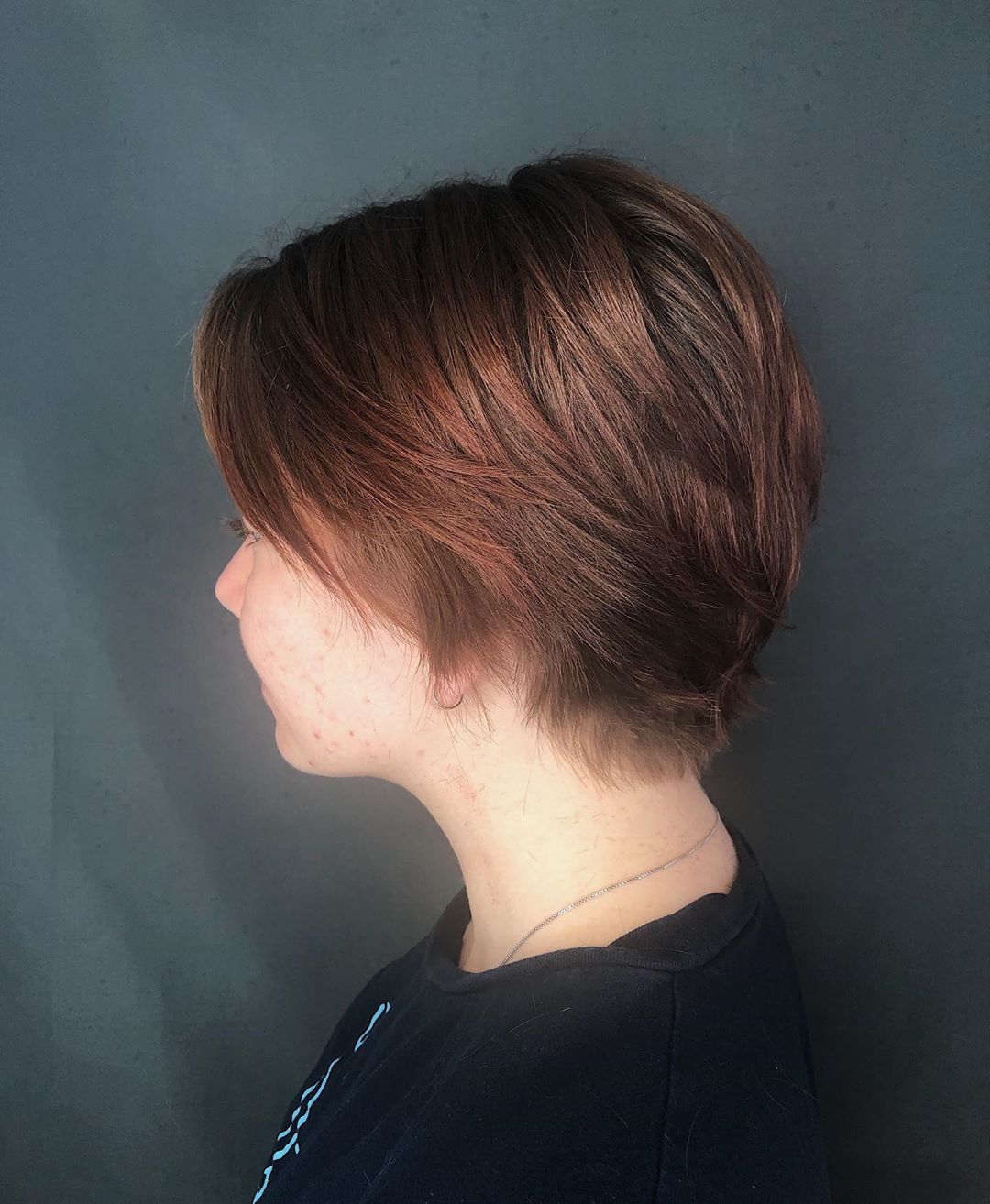 Стрижка «лесенкой» вносит корректировки в виде различных длин. Спереди волосы подстрижены в виде градиента: от короткого к удлиненному. Затем самая длинная линия волос укорачивается к основанию шеи сзади.