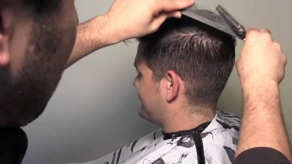 - Чтобы сделать мужскую стрижку машинкой с переходом начиная од коротких до длинных волос, прижмите ее ближе к теменной области головы. Затем расчешите волосы в разные направления и снова пройдитесь по всей окружности.