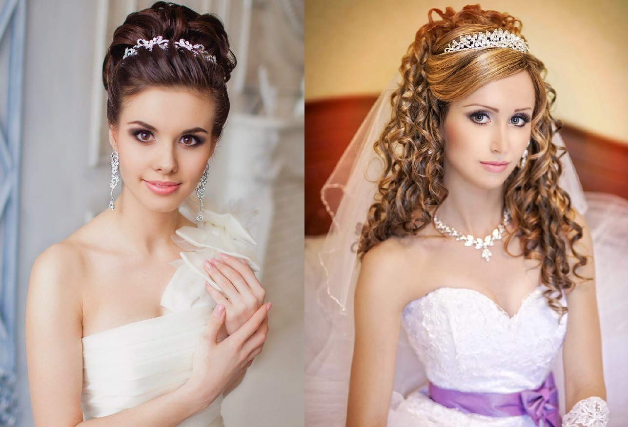 Есть масса способов укладки волос для торжественного случая. У кого-то волосы короткие, у кого-то кудри, кто-то заботится о шикарных локонах — прически делаются с учетом индивидуальных особенностей. Кстати, на выбор влияет и овал лица. Прически с тиарой выигрышно смотрятся и подчеркивают женственность и в случае, когда есть фата, и когда свадебный образ не предполагает ее наличия.